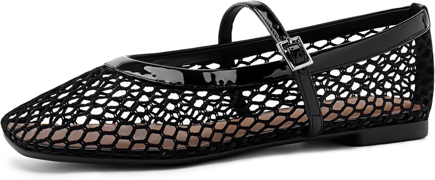 Women‘s Mesh Ballet Flats Comfortable Square Toe Ballerina Flats Buckle Strap Casual Fishnet Flat Shoes