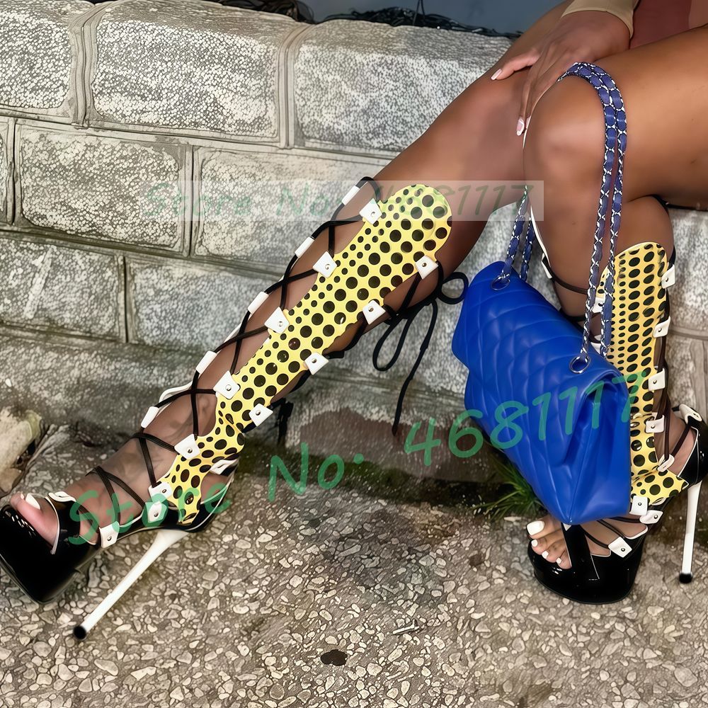 Strappy Polka Dot Platform Sandal Boots Women Sexy Party Cross Tied Mixed Colors Shoes Open Toe Women Summer Knee High Sandals