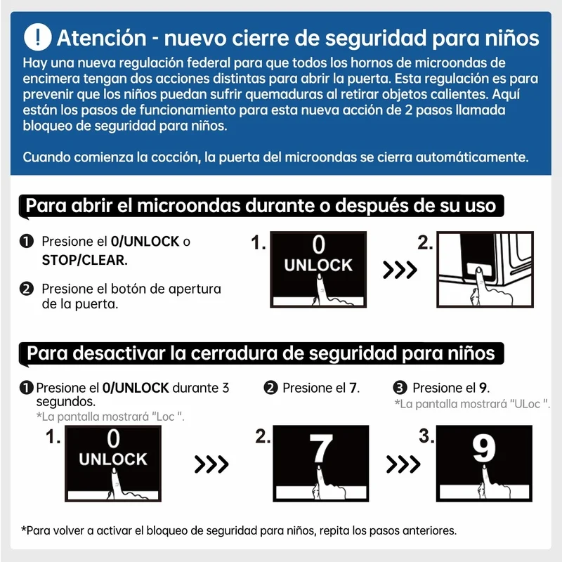 Capacity 0. 7 Cu ft LED display Kitchen timer & clock Weight & time defrost Child-safe lockout 700-Watt Power Push-button door opening 30 Second one-touch option Condition: New 10 Power levels 6 Quick-set menu buttons Stock Number: MS8436127995-01