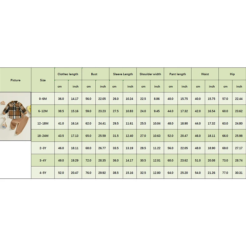 0-6M Tops Length: 14.17 Bust: 22.05 Sleeve: 10.24 Shoulder: 8.86 Pants Length: 15.75 Waist: 15.75 Hip: 22.44 Advised Age: 0-6 Months