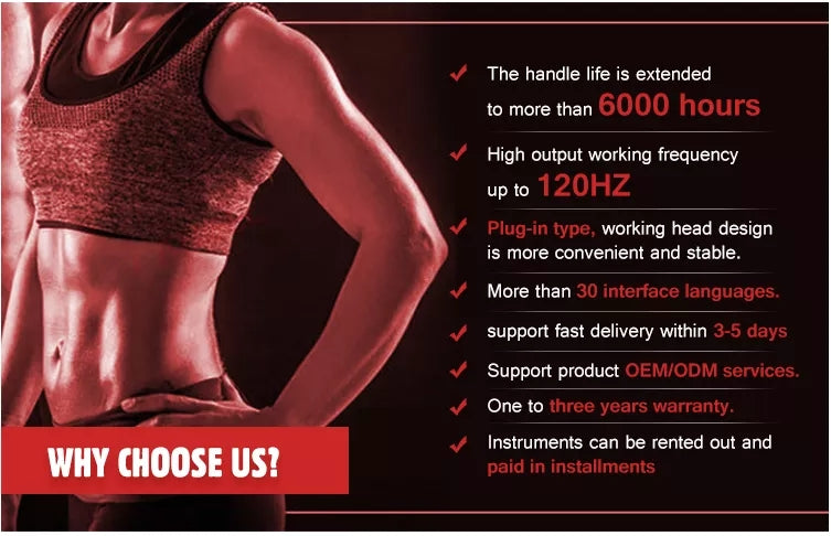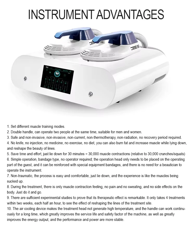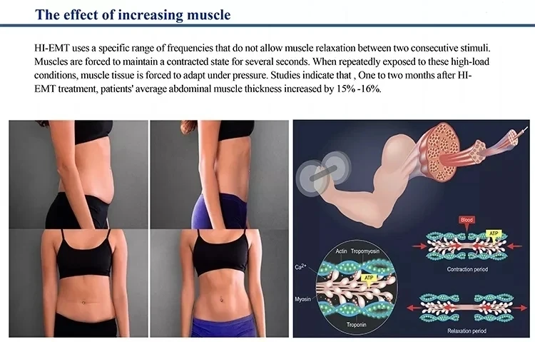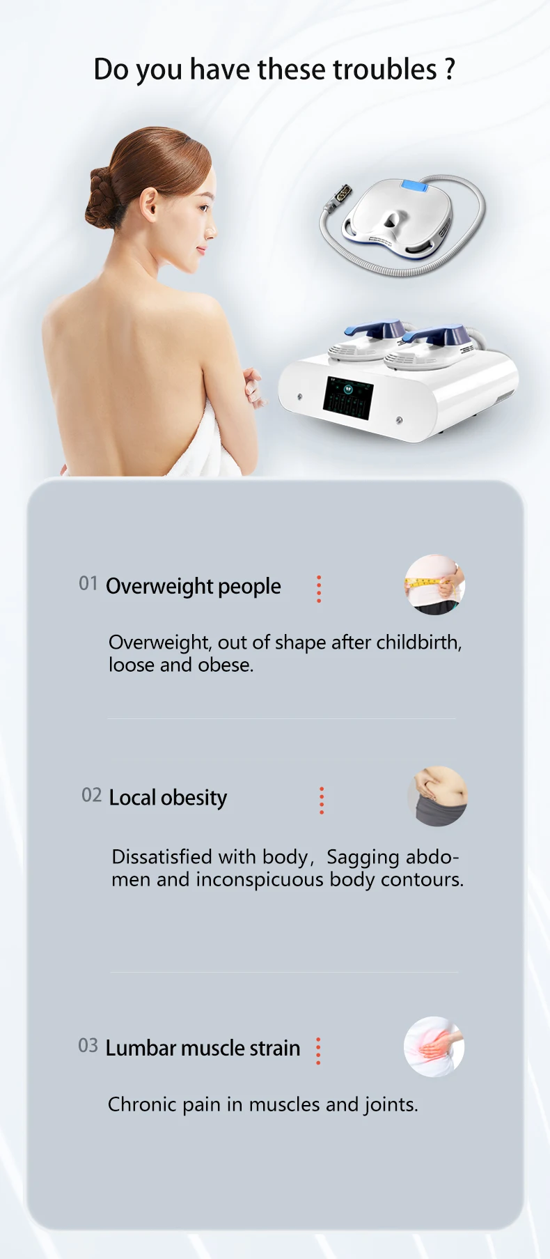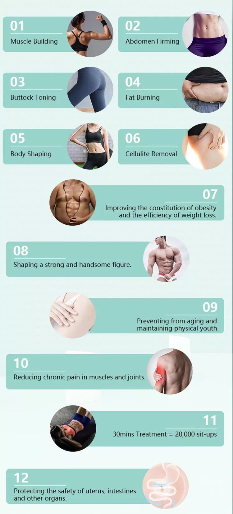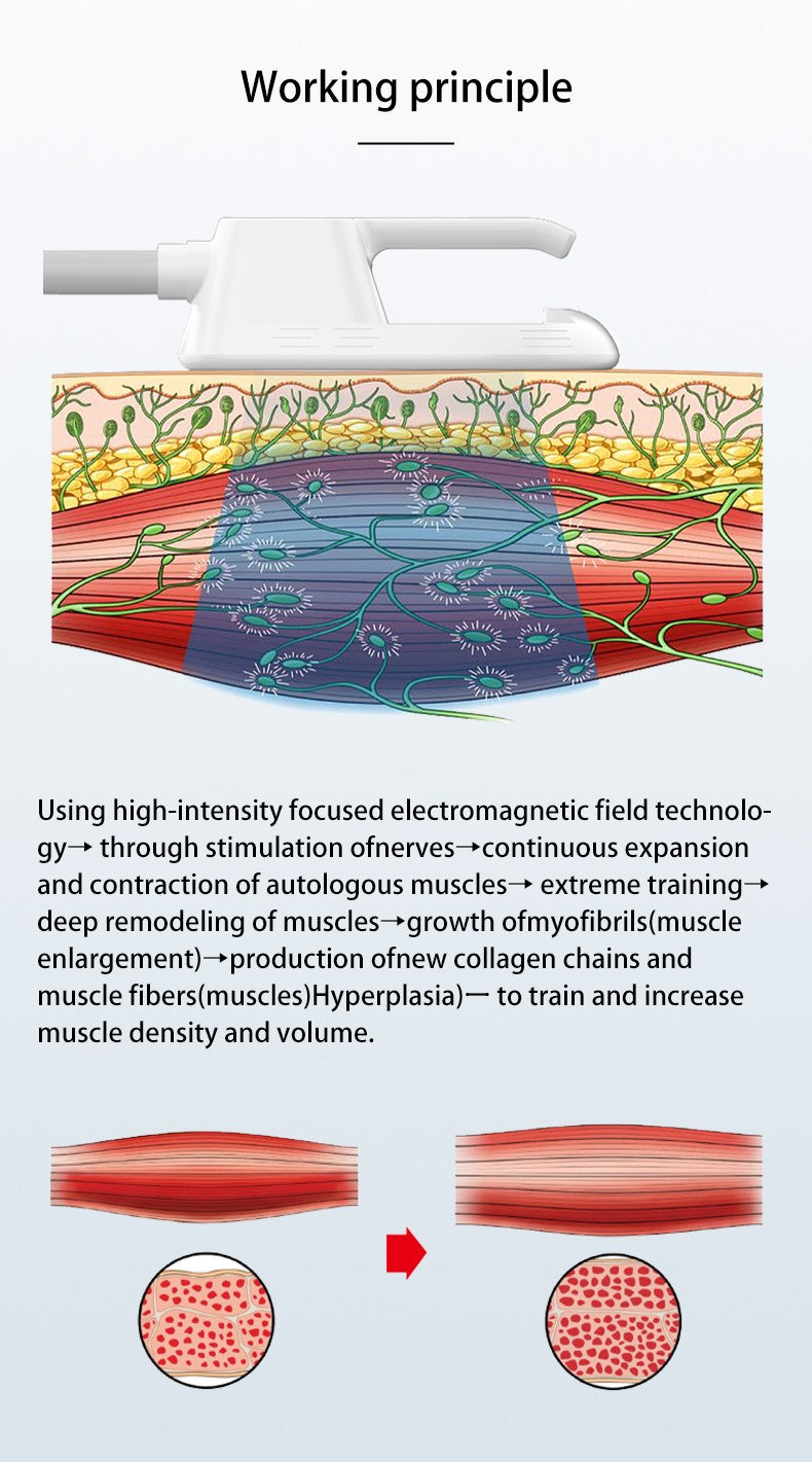Using the most advanced High Intensity Electromagnetic Energy Technology, the motor neurons in the muscles are directly stimulated with high frequency and high magnetic force to induce the muscles to produce extreme contractions. This kind of contraction is an intensity that cannot be achieved by ordinary exercise. One treatment is equivalent to 20,000 maximum muscle contractions, which ultimately increases muscle mass, makes the muscles stronger and clearer. At the same time, it can accelerate the decomposition of fat, effectively reduce the fat cells, and will not appear the phenomenon of loose skin after fat loss, helping customers to achieve a slimmer and more athletic body contour.