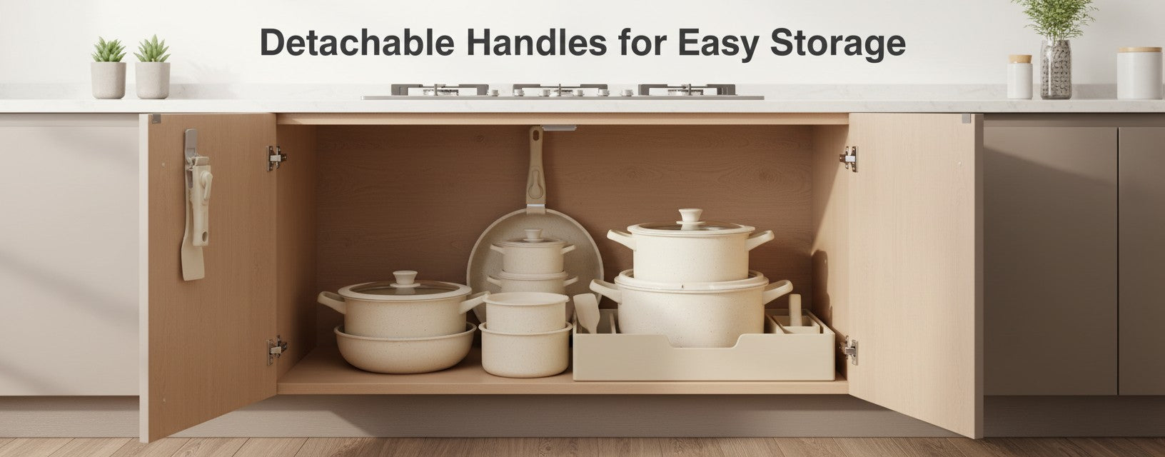 Featuring detachable handles, this cookware set is not only practical but also space-saving, allowing for easy storage in tight kitchen spaces. The cream and gold design adds a touch of elegance, making your kitchen look as good as the meals you prepare.