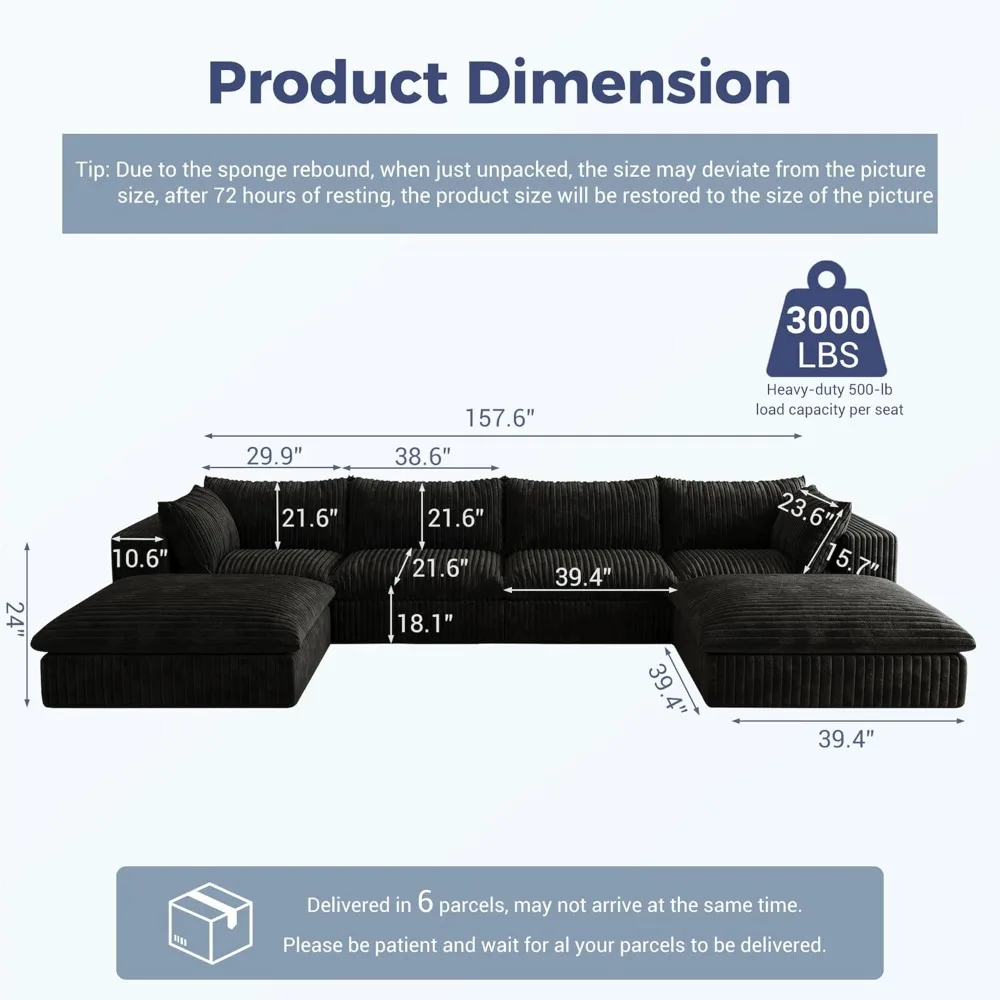 157.6" Oversized U Shaped Modular Boneless Sofa with 2 Ottomans, Cloud Sectional Couches for Living Room, Deep Seat Corduroy