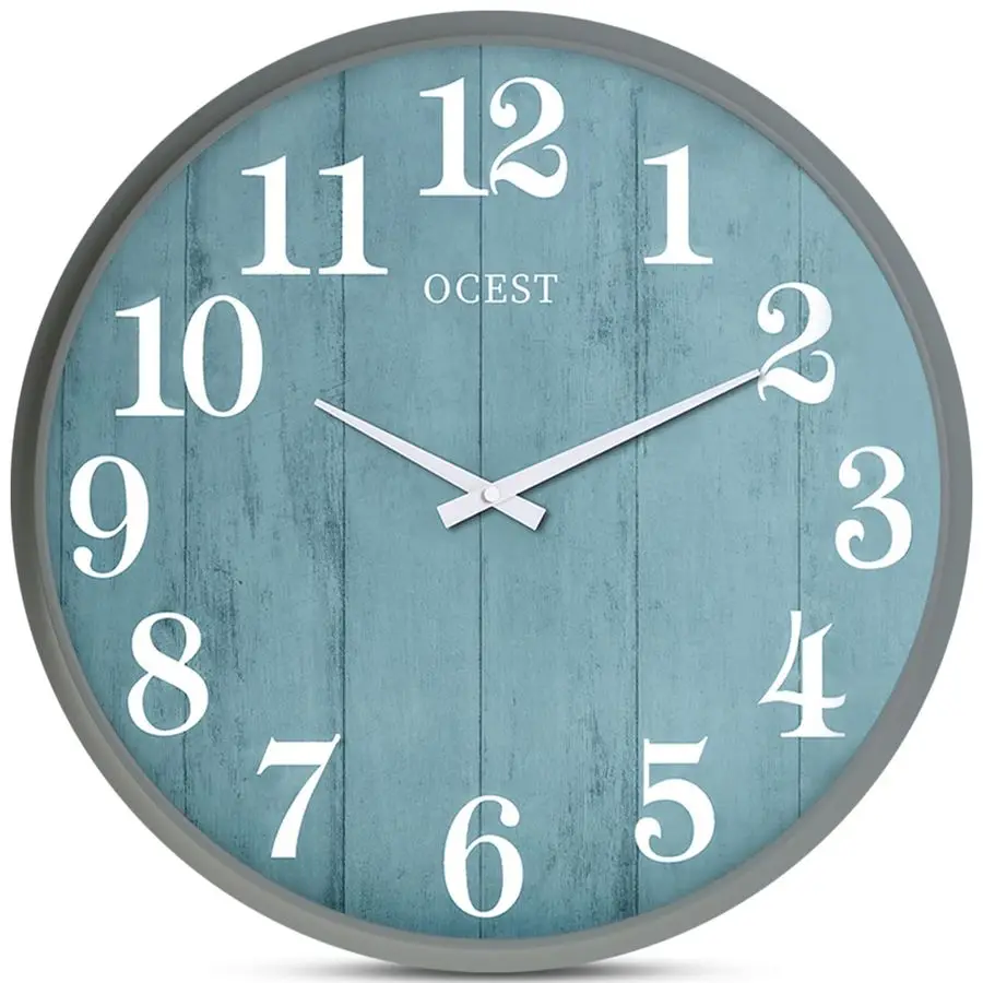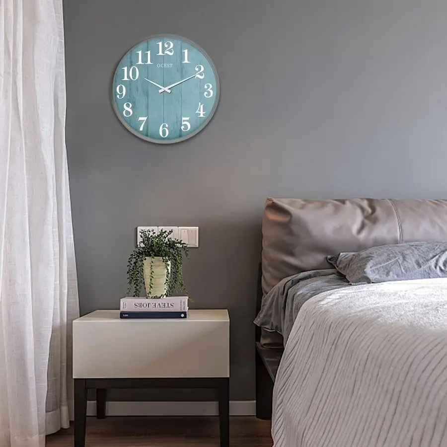 Large Display Clock Featuring an 18inch dial with bold white Arabic numerals on a stylish blue woodgrain background, this big wall clock ensures easy readability from anywhere in your living room, bedroom, kitchen, bathroom, farmhouse, office, lounge, or garage. The durable plastic frame and flat glass lens make it easy to clean and resist dust buildup