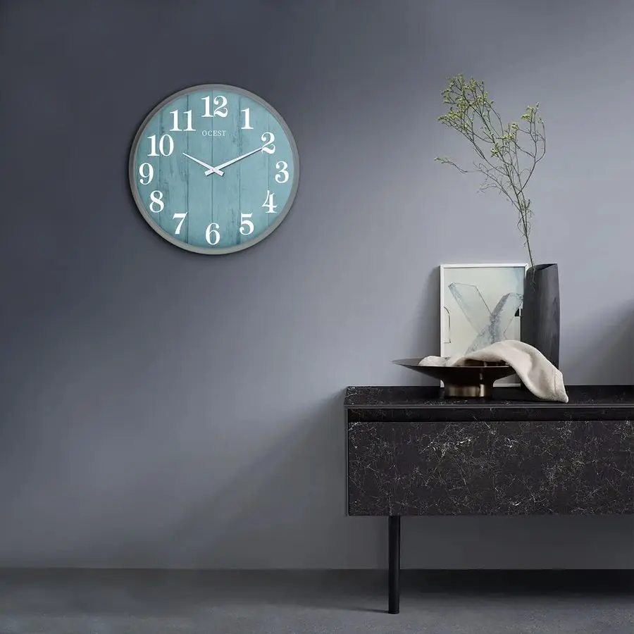 Decorative Clock With a sleek gray frame and stylish blue wood grain design, this modern wall clock effortlessly elevates your room39s aesthetic. Perfect for hanging above a fireplace, in a cozy nook, or as a centerpiece in your dining area