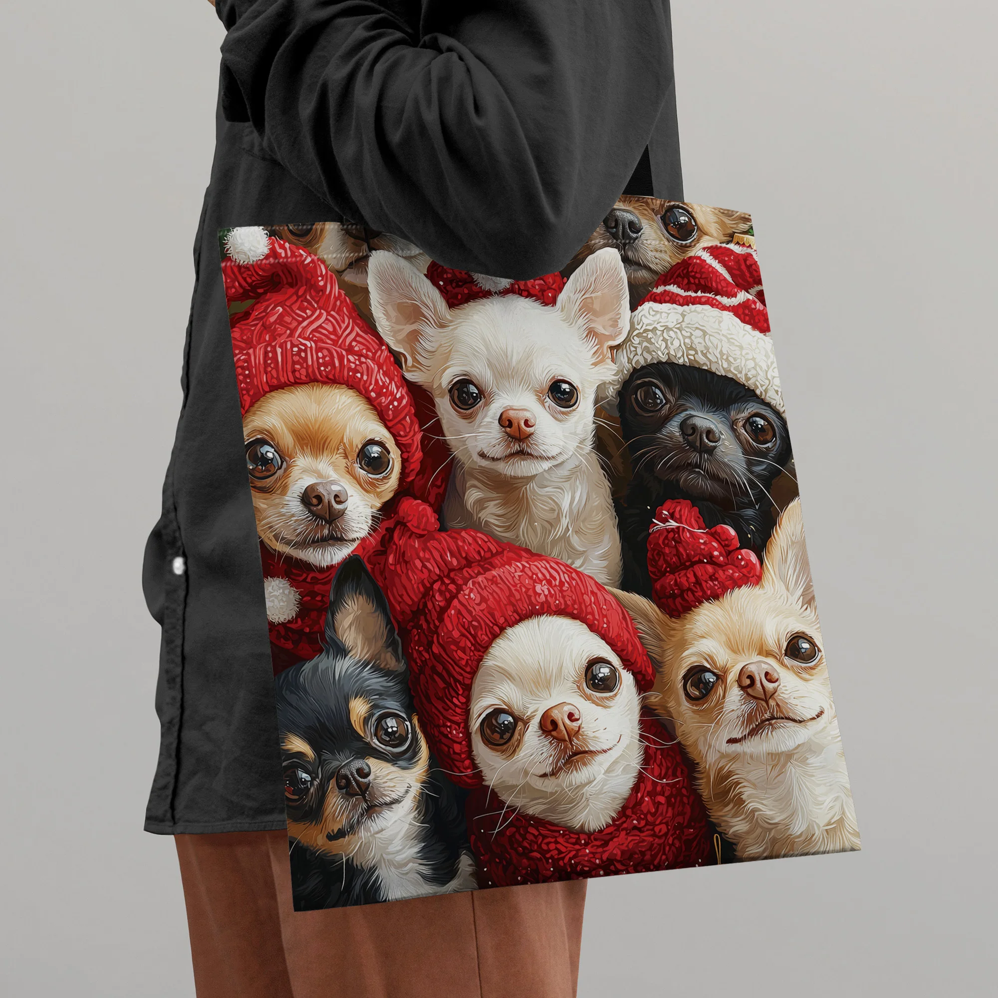 1pc Chihuahua Print Polyester Tote Bag, Durable Reusable Shopping Shoulder Bag with Cute Animal Design