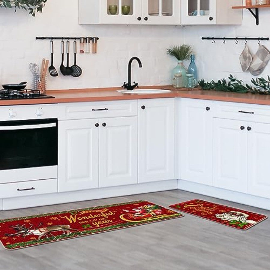 2 Pcs Christmas Kitchen Rugs Black Santa Christmas Decorations Xmas Winter Floor Mats Non Slip Washable Rubber Backing Doormat