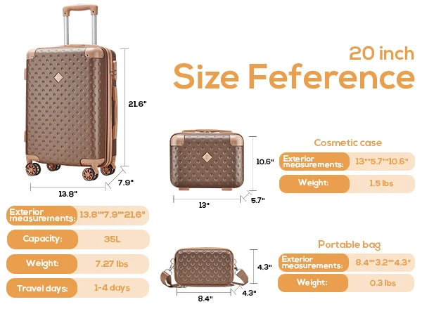 3 Piece Luggage Sets: This set includes a 20" carry-on, a 14" cosmetic case, and a 7" hard portable bag. They nest together for easy storage. Perfect for short business trips or weekend getaways.