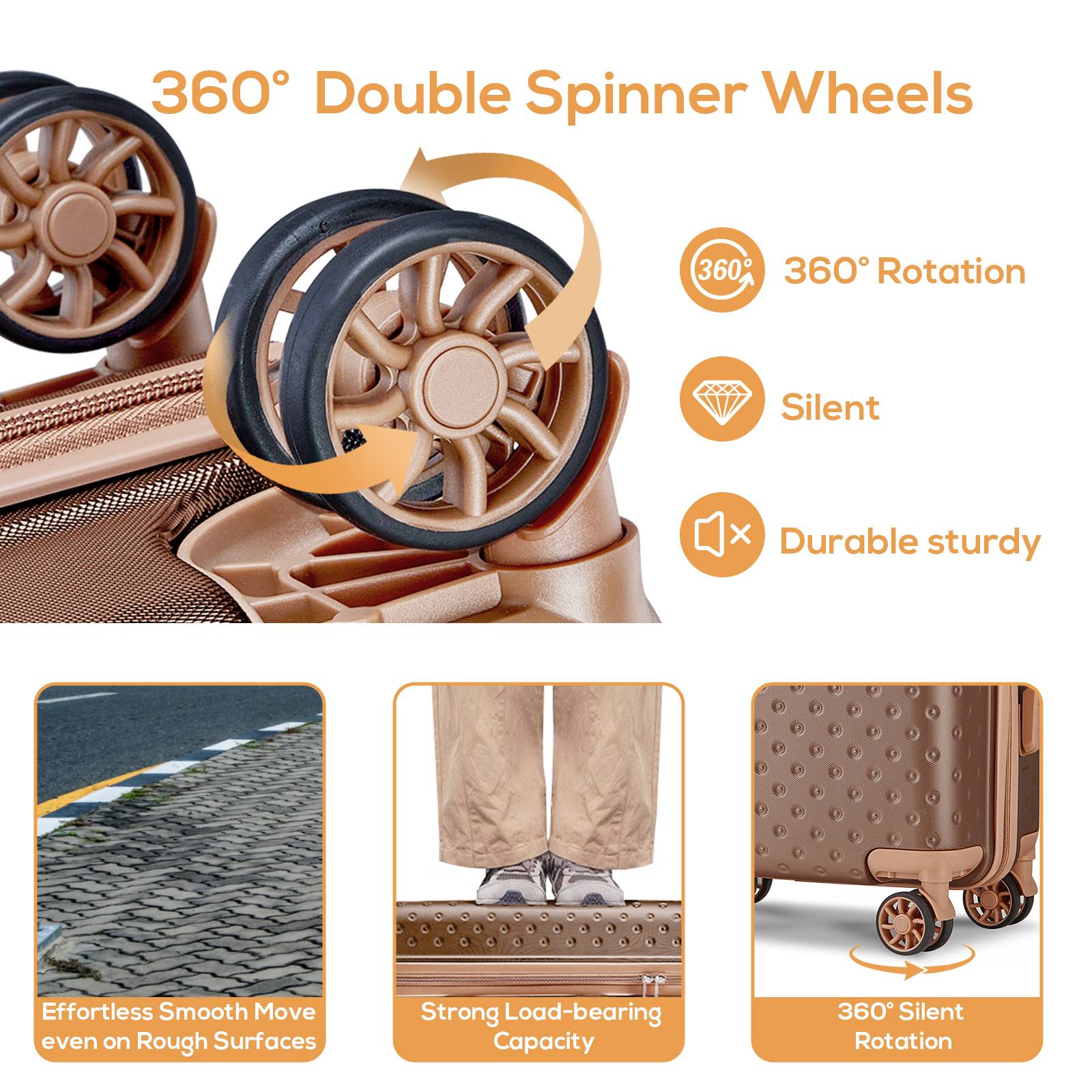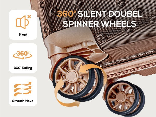 360° Silent Double Spinner Wheels: The carry-on measures 21.6x13.8x7.9 inches and is airline-approved. It features durable rollers for smooth, quiet travel through airports and on roads. Move your luggage effortlessly!
