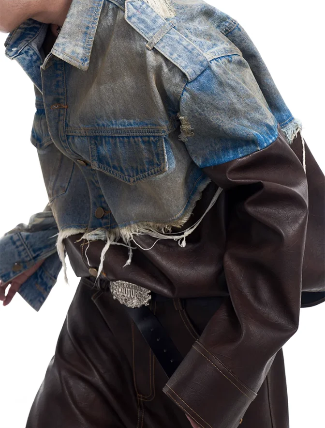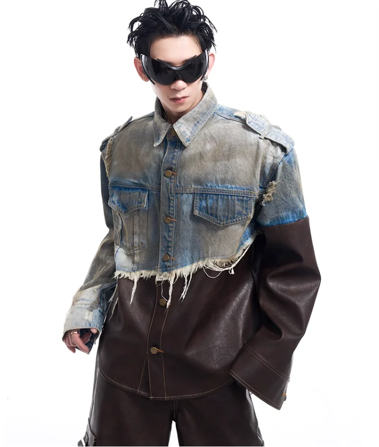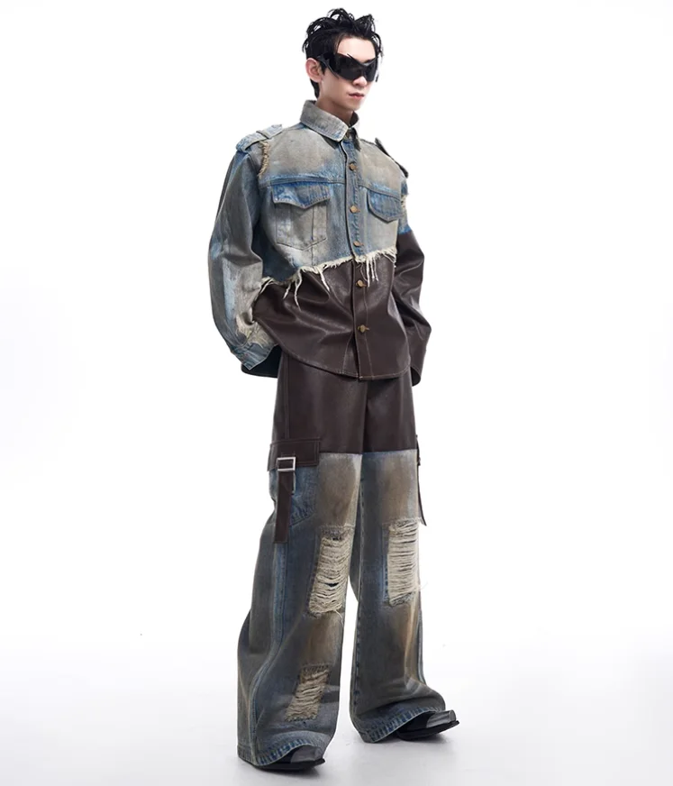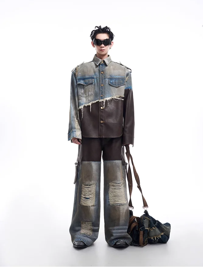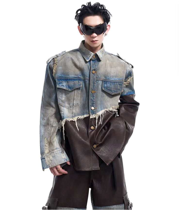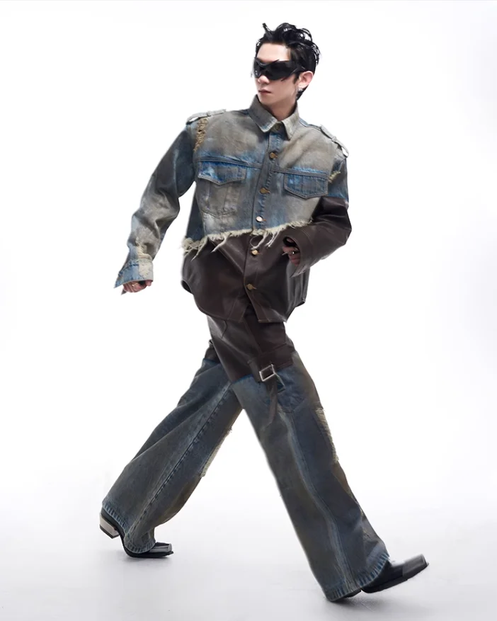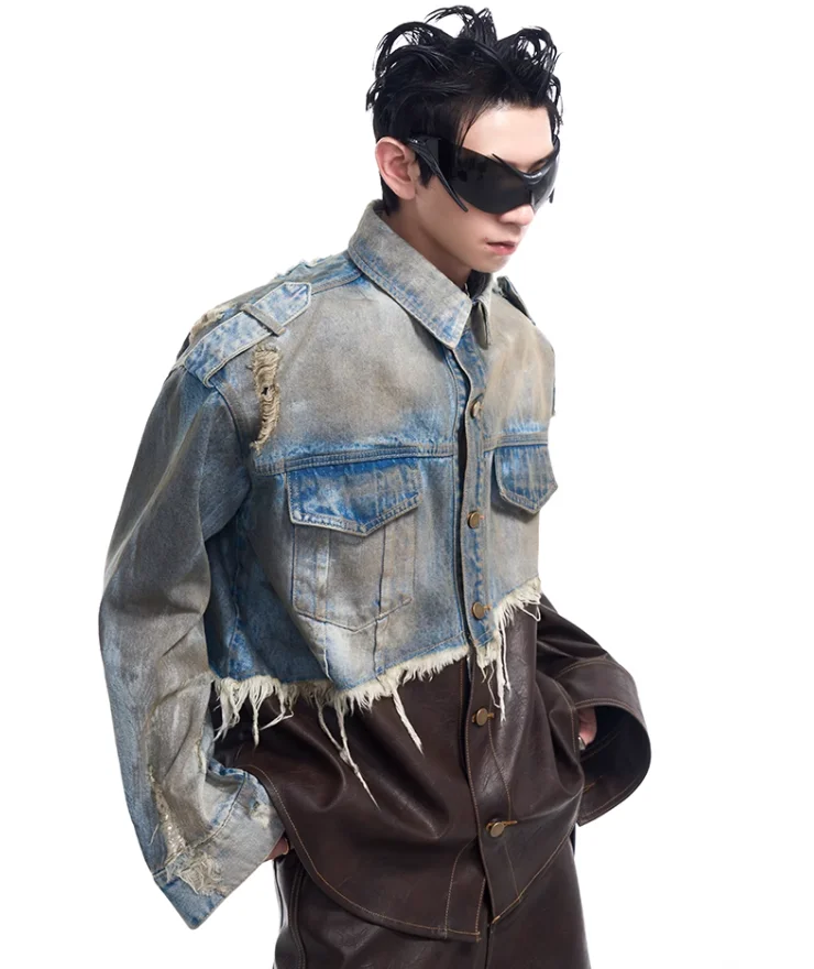 2024 American vintage do old piece-leather destruction denim jacket men fall dirty jacket