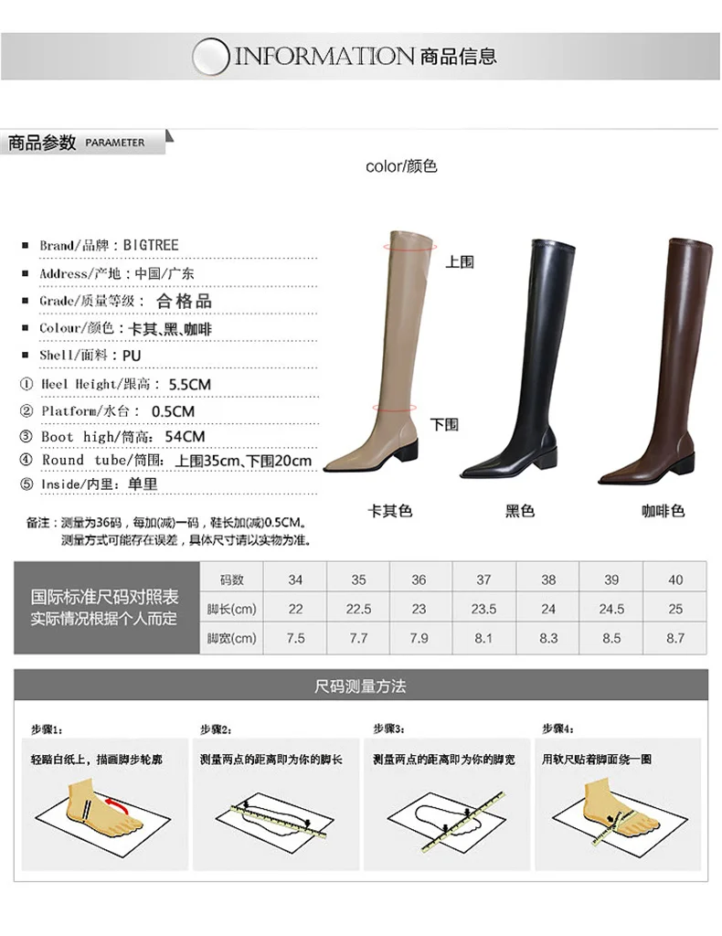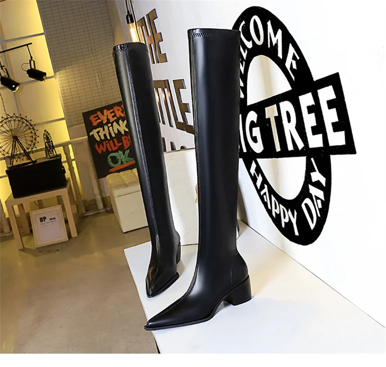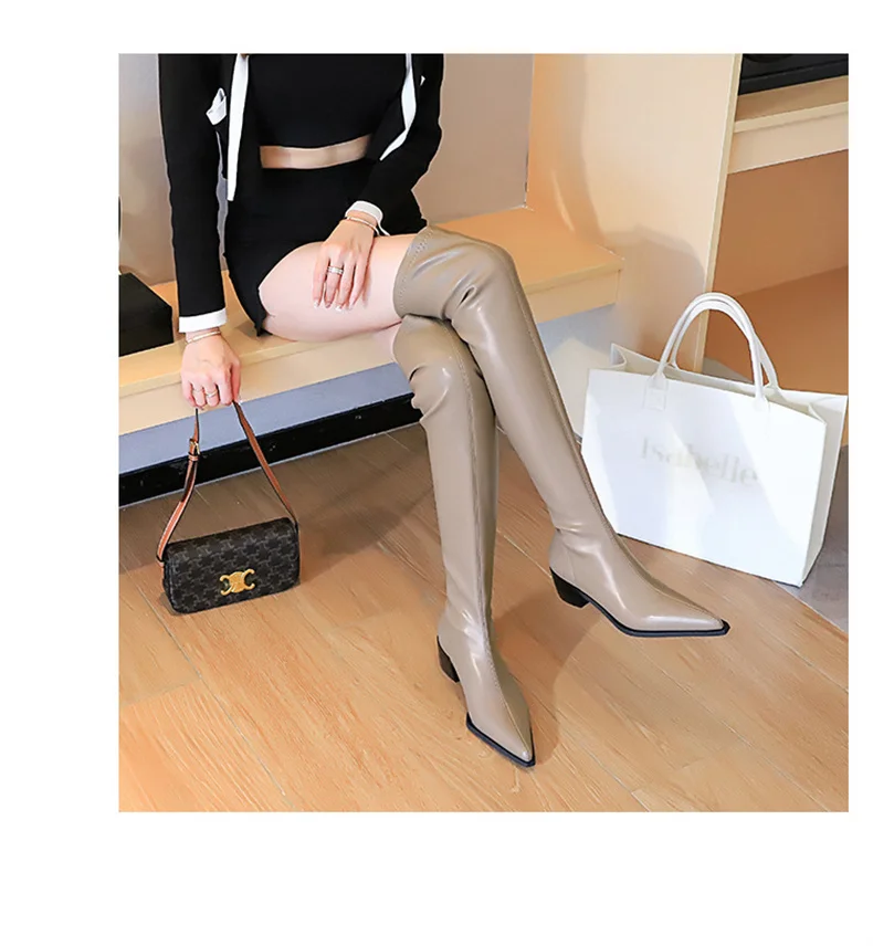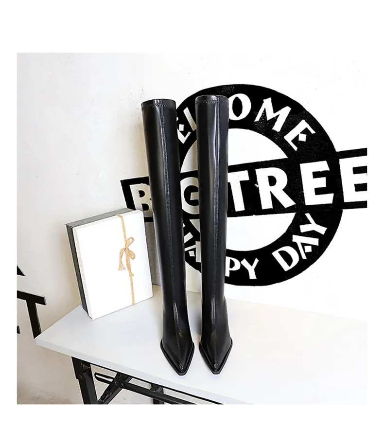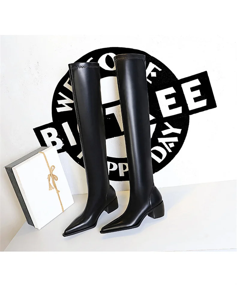 2024 New Autumn Women's Pointed Toe Boots Over-the-Knee Sewing Slip On PU Leather Square Heel Street Style Shoes Black