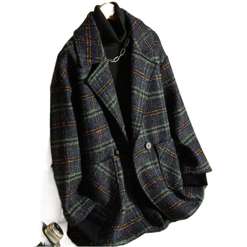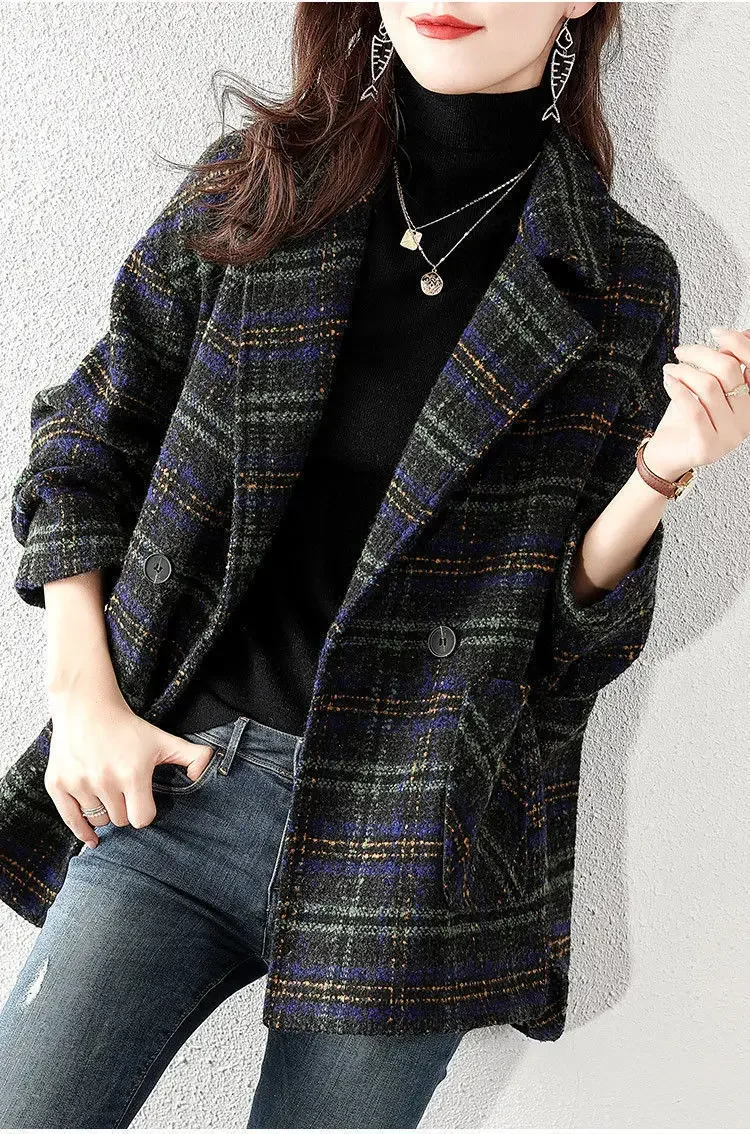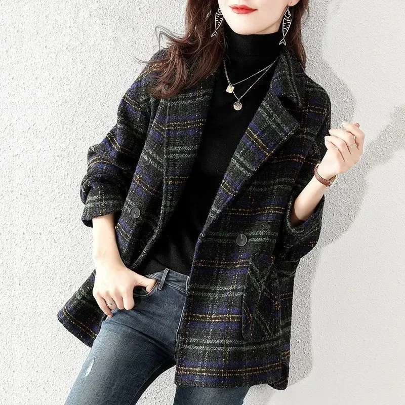 2024 New Style Women's Plaid Suit Woolen Jacket Loose Fit Vintage Checked Woolen Coat Medium Length Korean Version