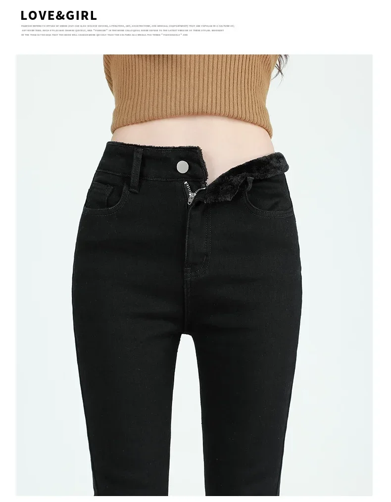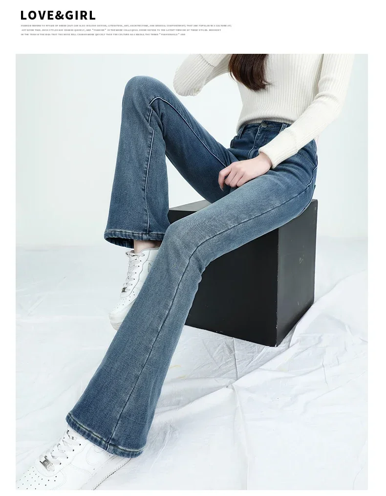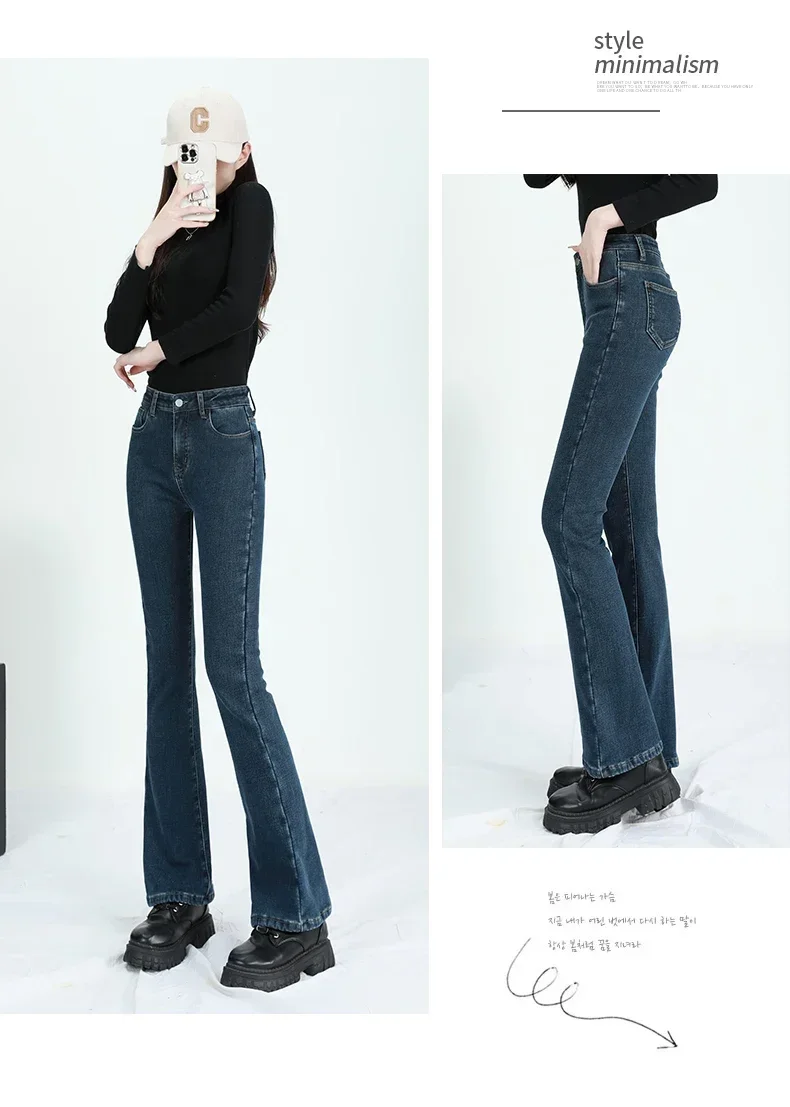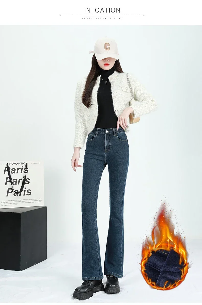 2024 Winter Fleece Women's Flare Pants Retro Slim High Waist Elastic Cotton Thick Warm Denim Pants Fashion Korean Female Clothes