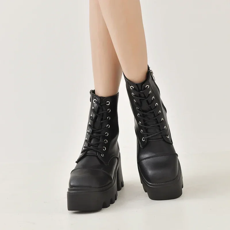 2024 Winter Plus Size Shoes for Women Side Zip Women's Ankle Boots Platform Square Heel Ladies Boots Lace-up Shoes Female