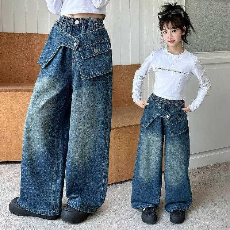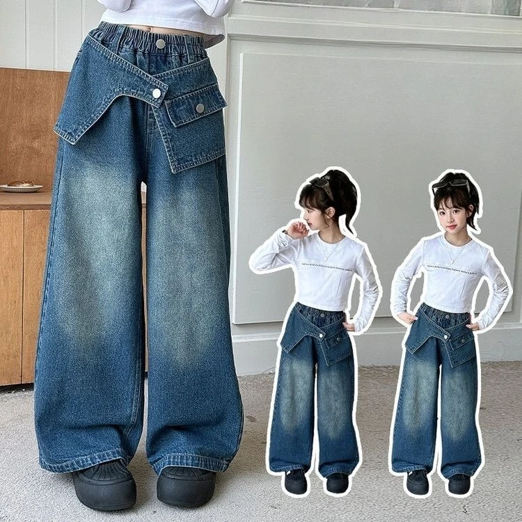 2025 Autumn Trendy Korean Style Flared Jeans for Girls - Medium & Large Kids, Ruffled Long Pants for Junior High Students