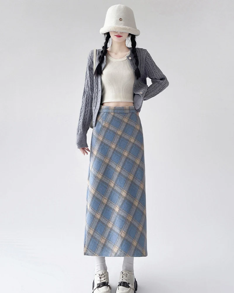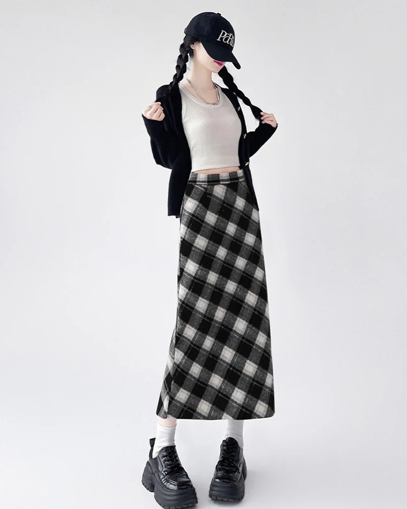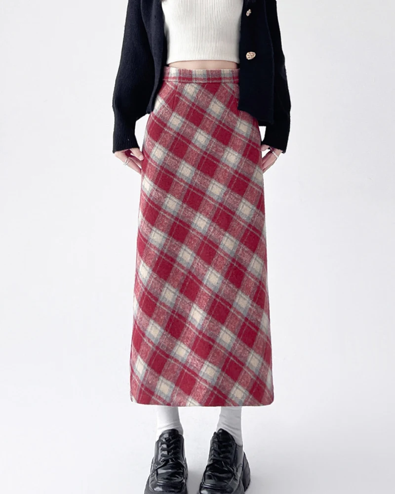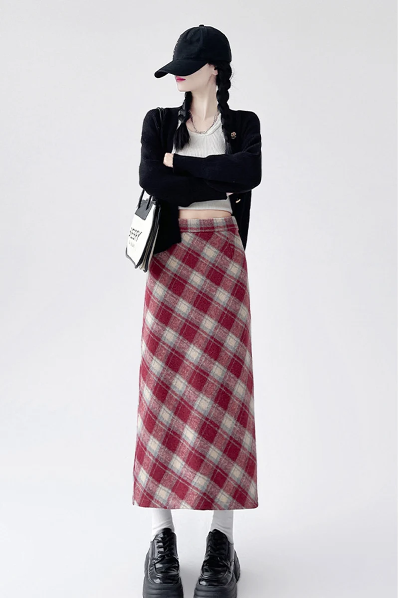 2025 Autumn Vintage Woolen Plaid Skirts Lady Elegant High Waist Slimming A-Line Skirt Women Korean Streetwear Slit Long Skirt