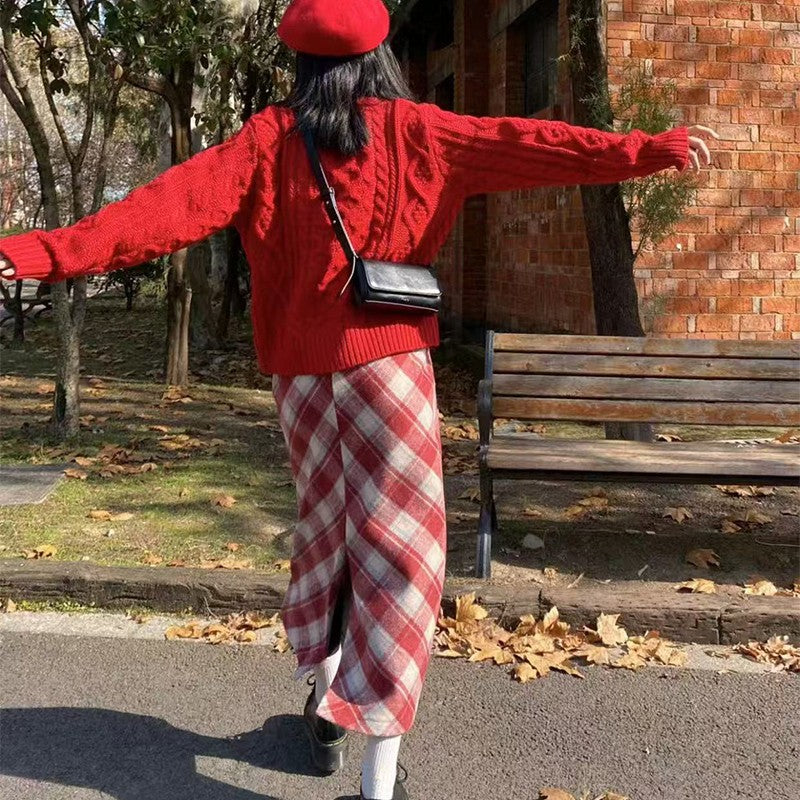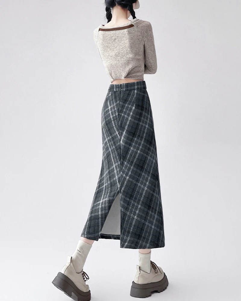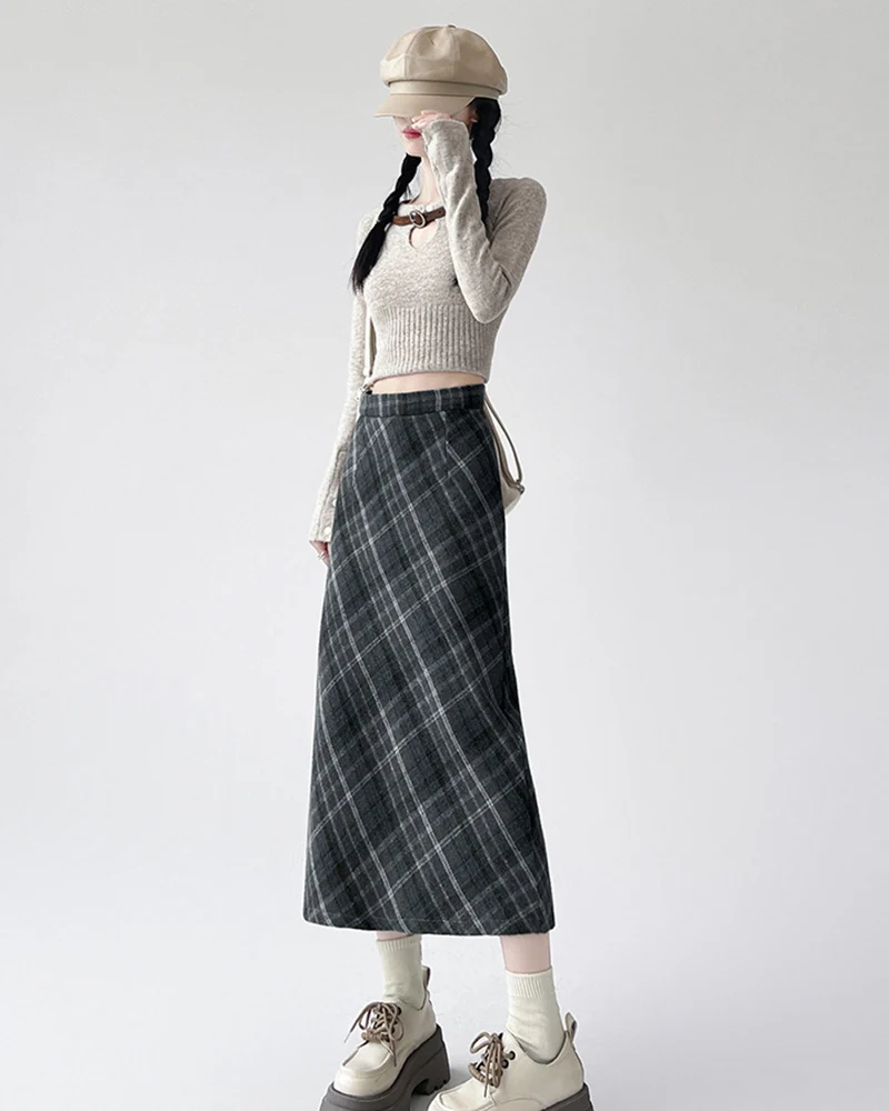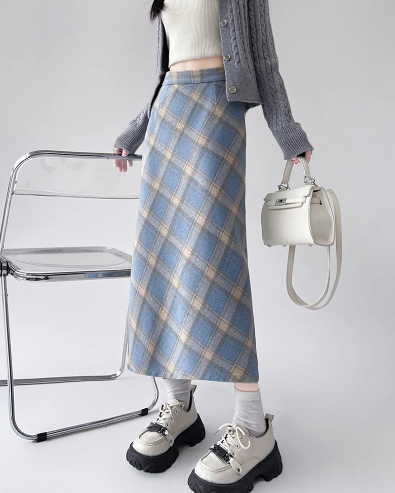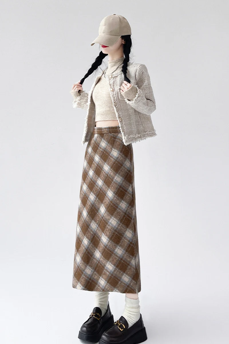 2025 Autumn Vintage Woolen Plaid Skirts Lady Elegant High Waist Slimming A-Line Skirt Women Korean Streetwear Slit Long Skirt