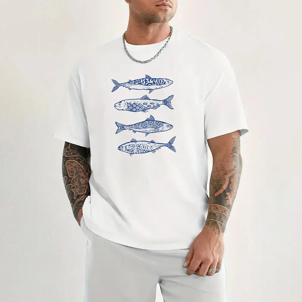 2025 Fish pattern print high quality 100% cotton t-shirt with round neck, summer trend short sleeves, street hip hop top.