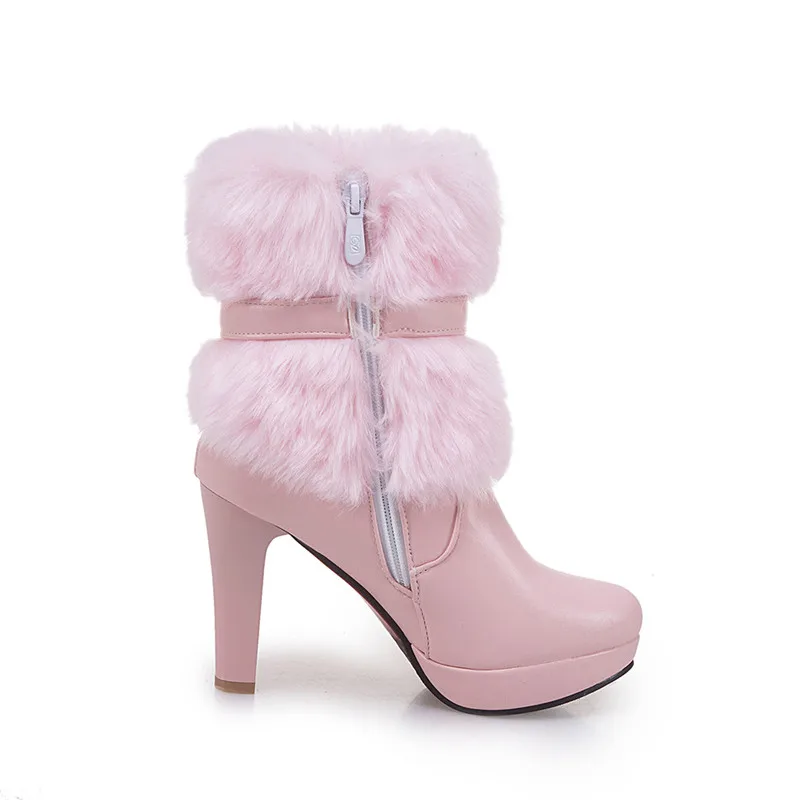 2025 New Fashion Womens Winter High Heel Boots Pink White Black Fur Tassel Bowtie Lovely Lolita Ladies Party Wedding Shoes