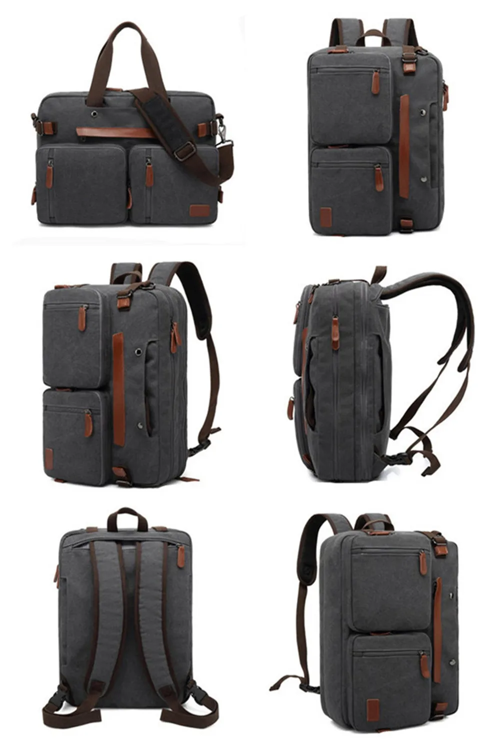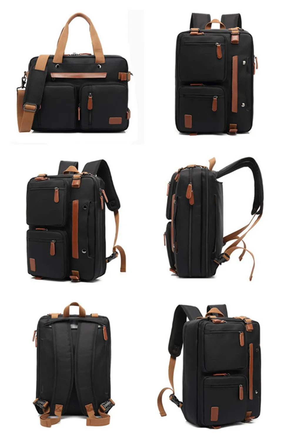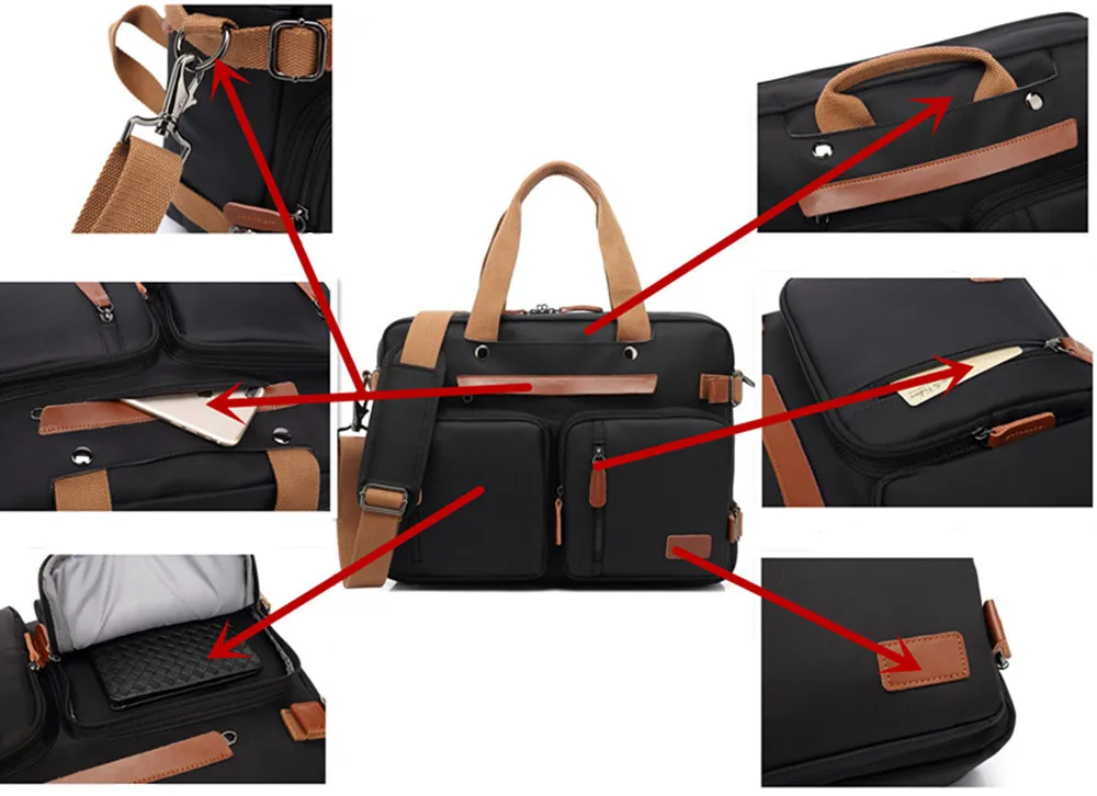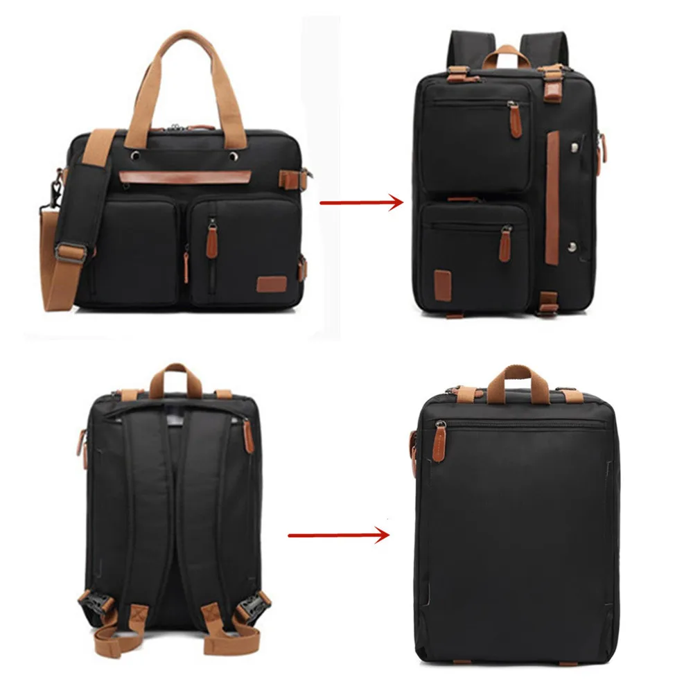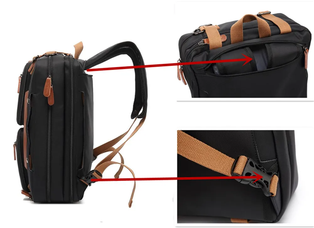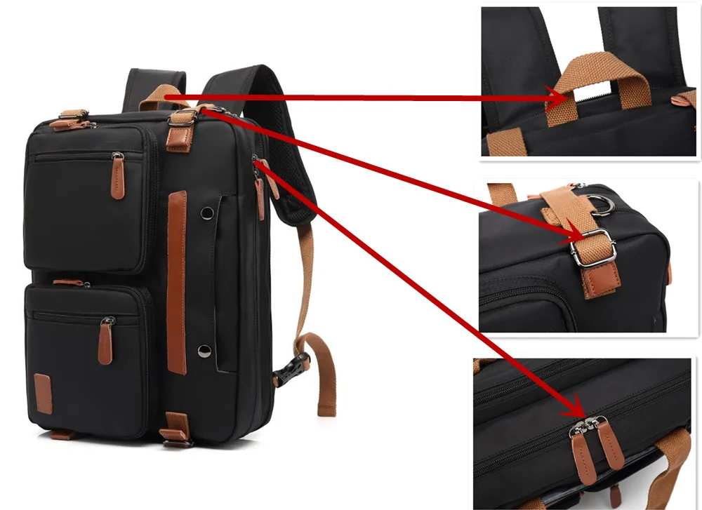 Convertible design. This bag can be easily converted to backpack, shoulder bag and briefcase.Removable shoulder strap is adjustable. The back strap can be hidden in a big back compartment when you use it as briefcase and shoulder bag.