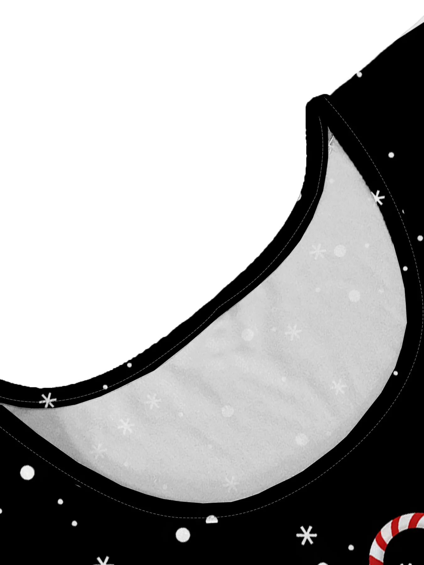 2025 New Snowman & Christmas Print Short Sleeve Dress Black with White Snowflakes & Red Hats Women's A-Line Dress Party Outfit