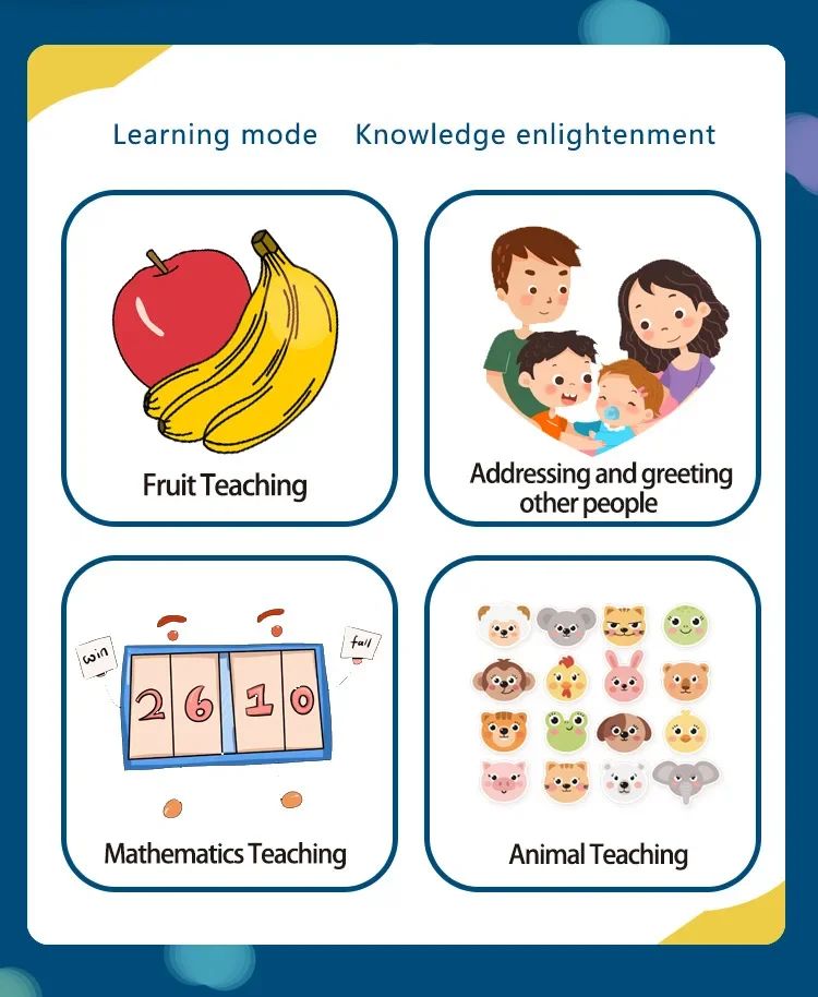 ?Mode Key?A. Hamster mode: (Lets play the Whac-A-Mole game+ round one) B, learning mode: (Kids, Lets learn together) C, music mode: (Kids Move with the music) D, random playing piano mode: (Kids, let me play a musical instrument freely) F. Drumming mode: (Kids, drum kit is my profession).