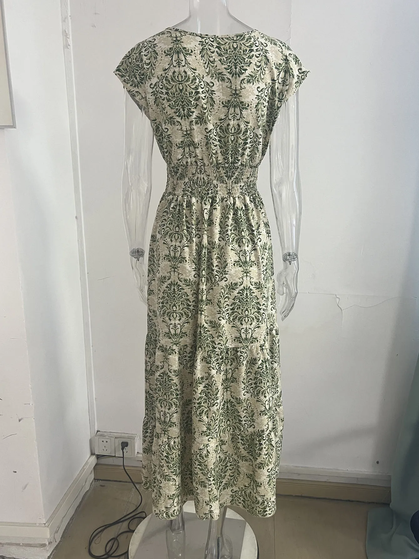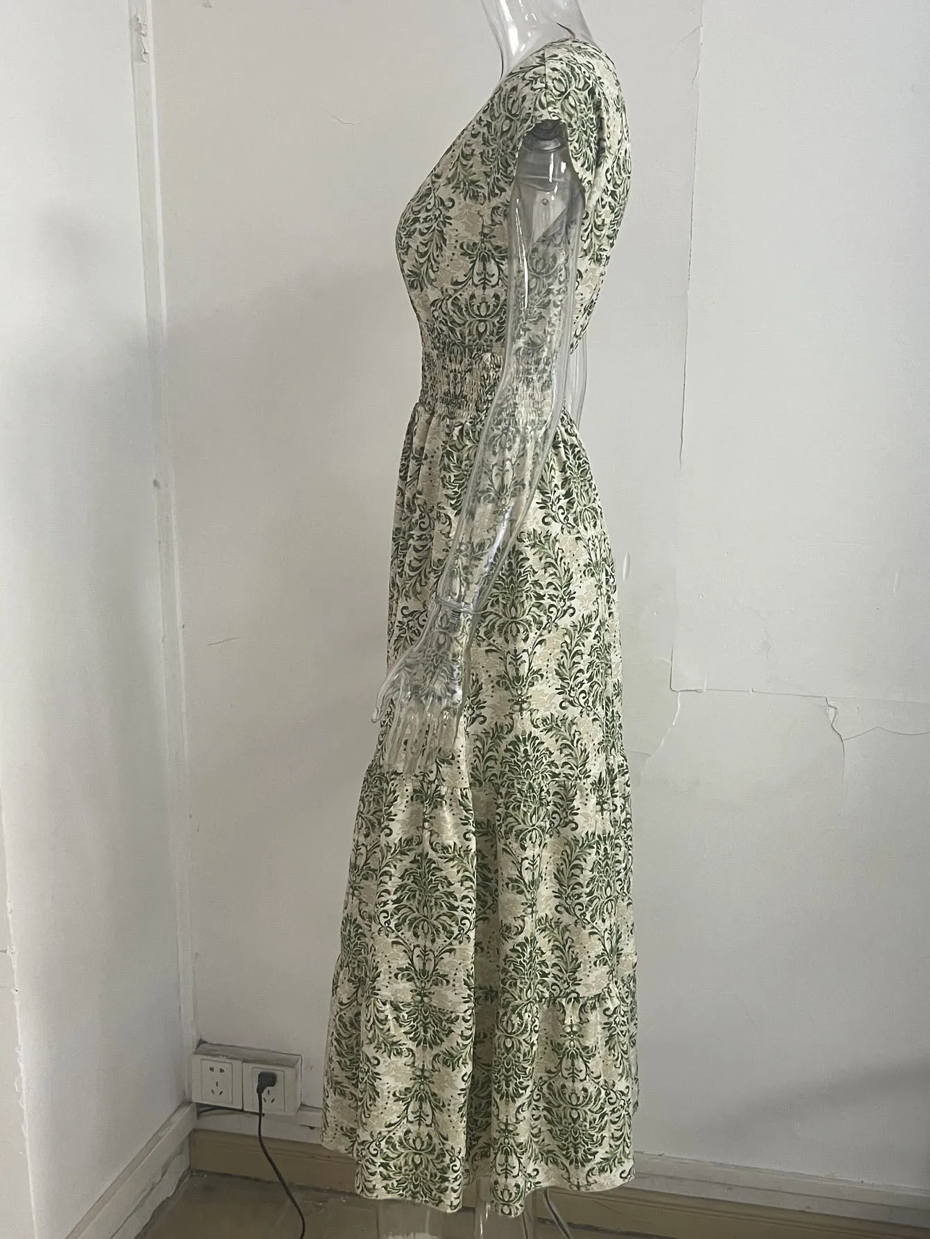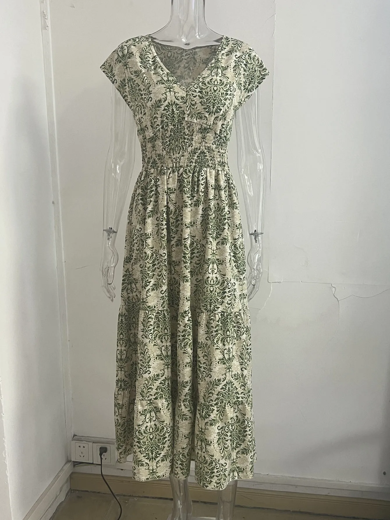 2025 vintage printed dress fashionable and elegant V-neck short sleeved jumpsuit long skirt women's clothing