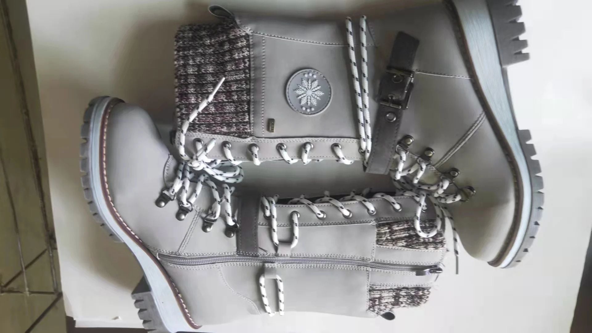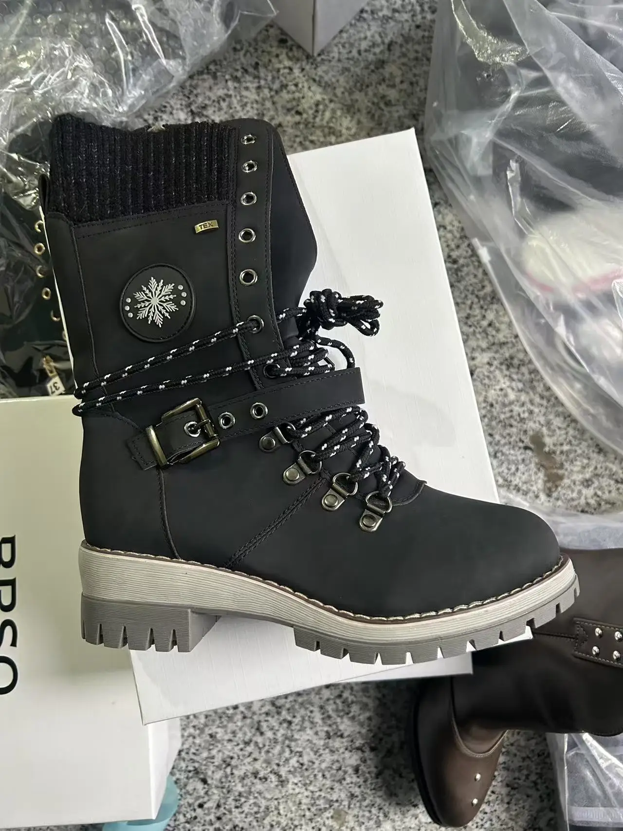 2025 Women Winter Buckle Lace Knitted Mid-calf Boots Low Heel Round Toe Boots Top Quality Winter Warm Boots Women Botas De Mujer