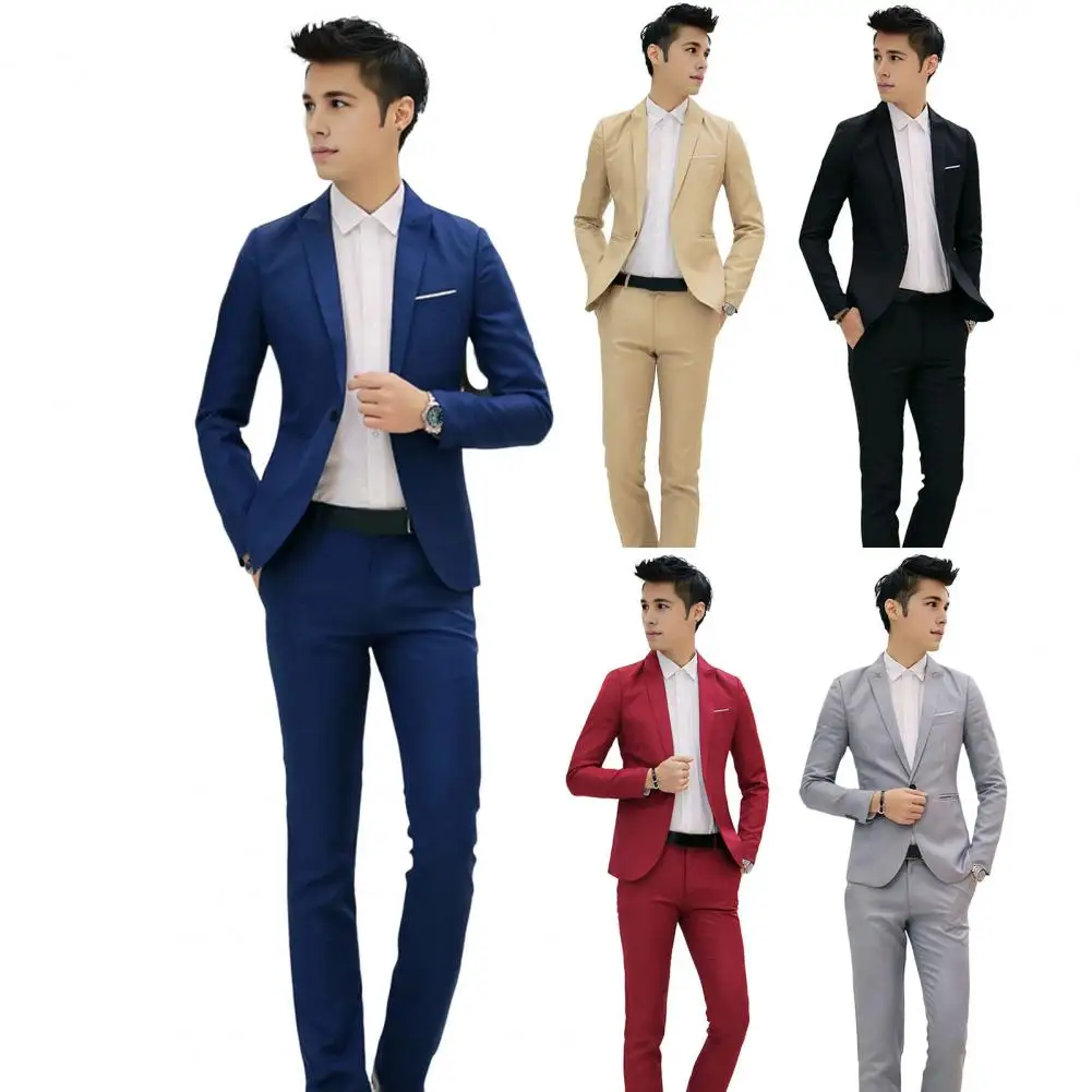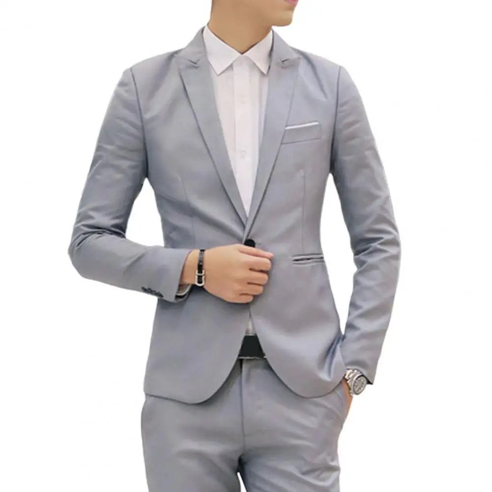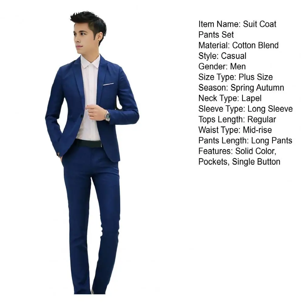 2Pcs/Set Men Slim Fit Suit Set Lapel Long Sleeve Single Button Suit Coat Mid-rise Long Pants Set Solid Color Business Outfit