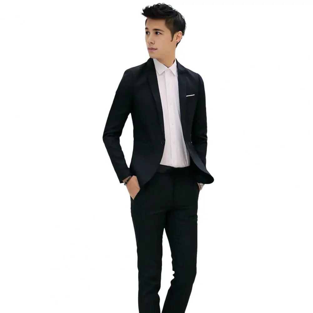 Classic Yet Stylish Design: Men's suit features a solid color scheme with a modern twist. The suit jacket is adorned with a single row of buttons and two open patch pockets, while the trousers boast a classic design that exudes sophistication and elegance.