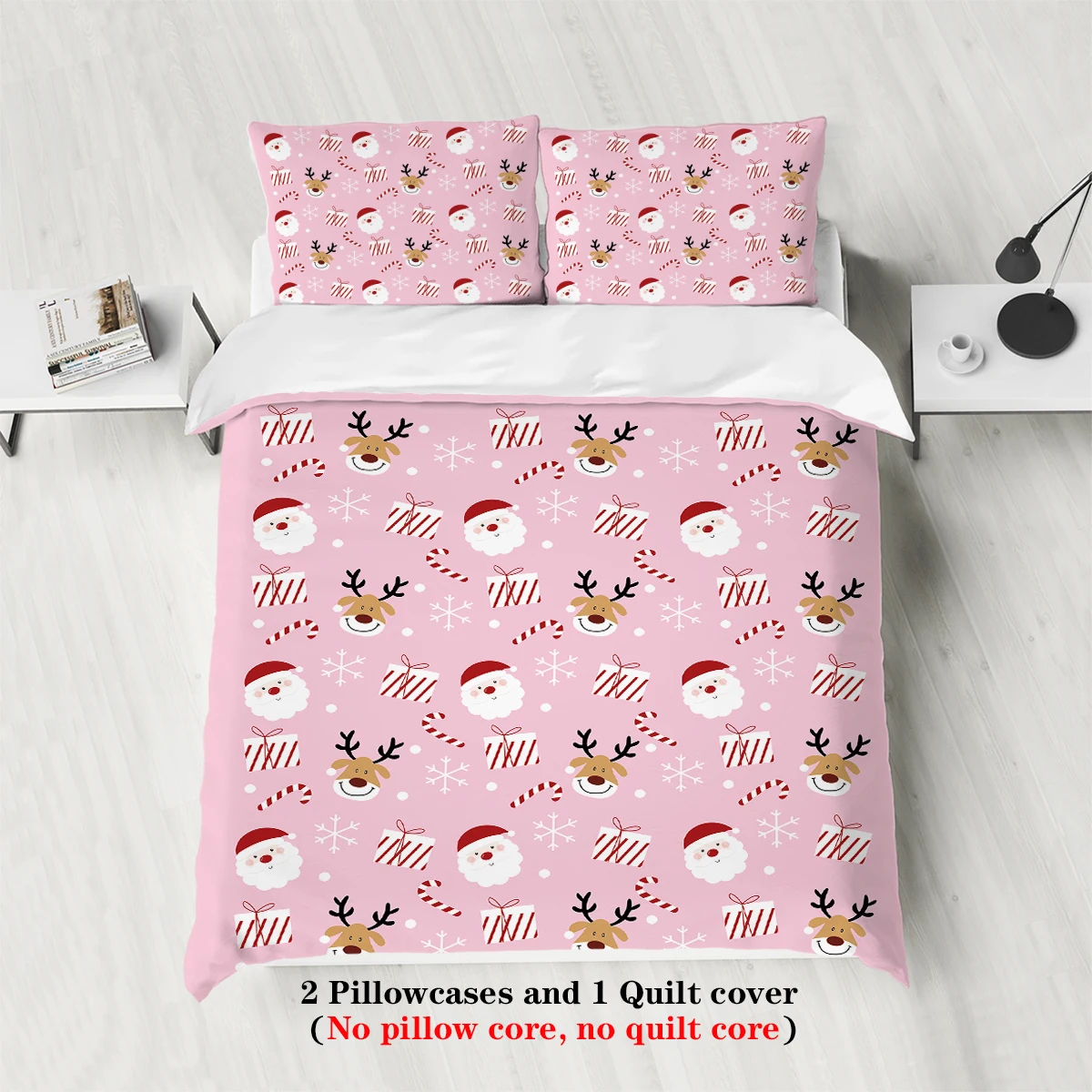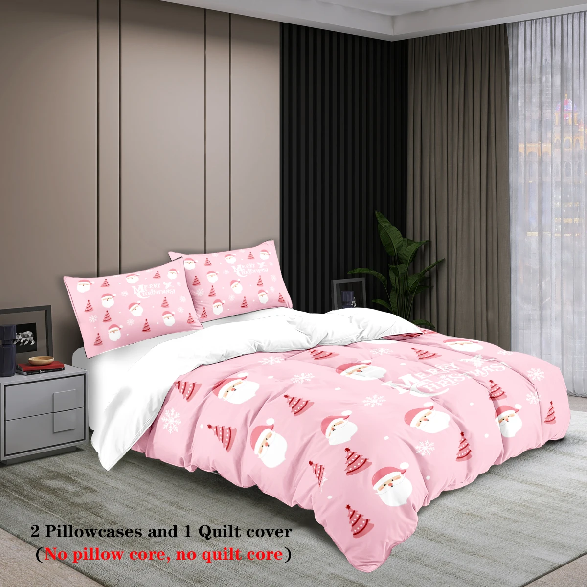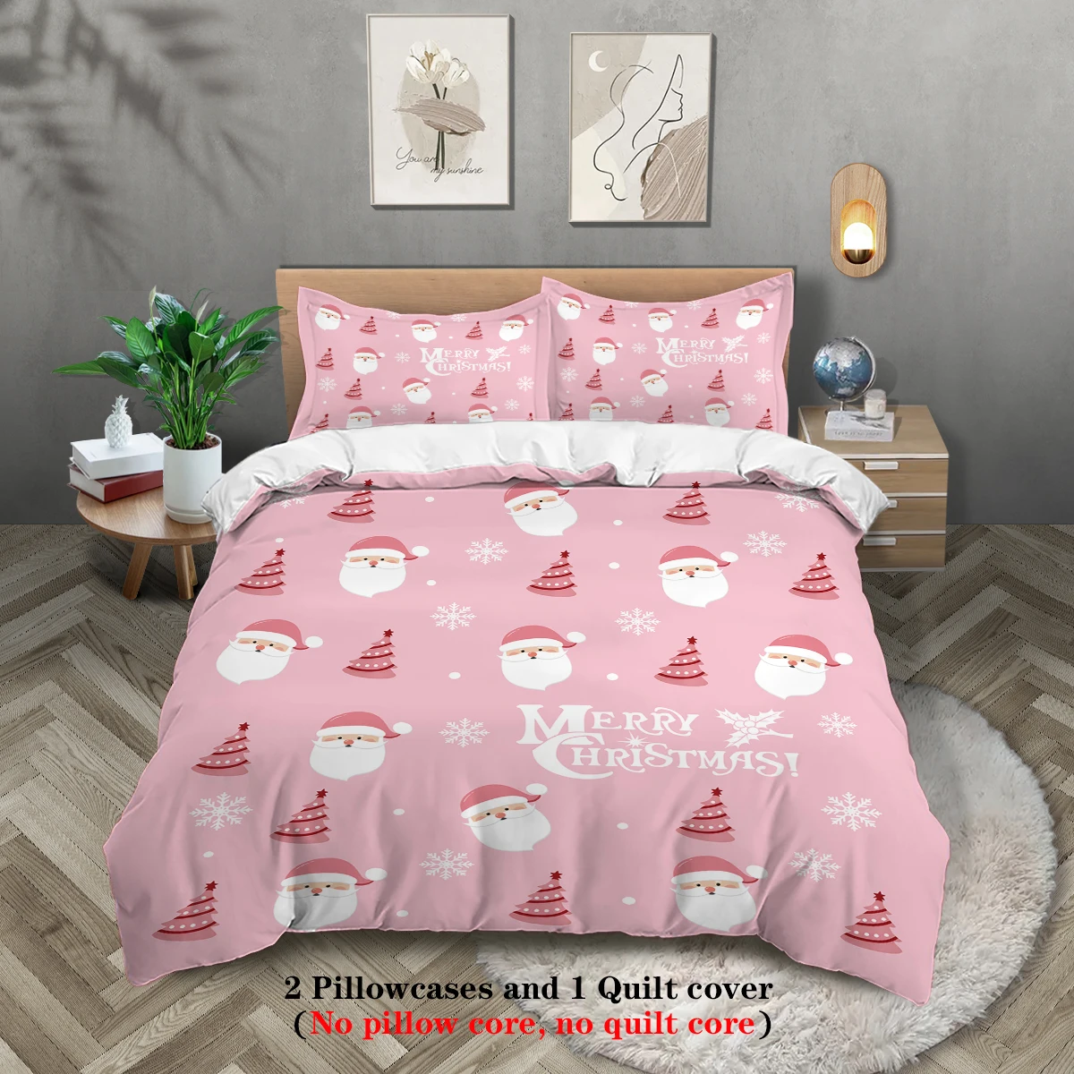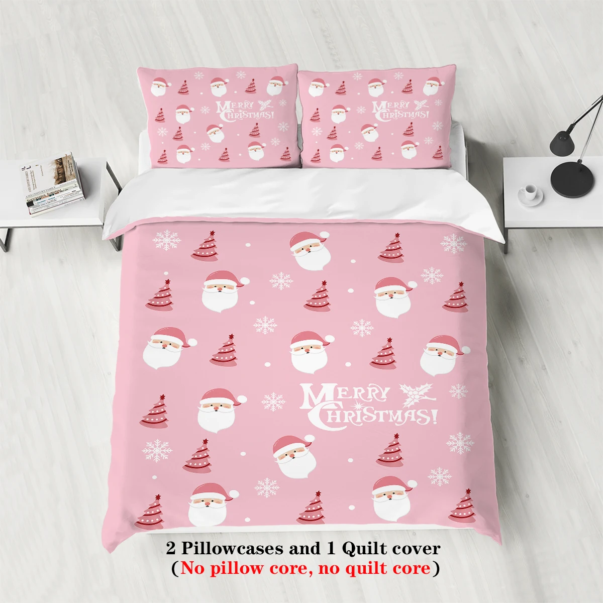 3-piece Christmas themed pink Santa Claus print (1 duvet cover+2 pillowcases, no core) soft and comfortable bedding set