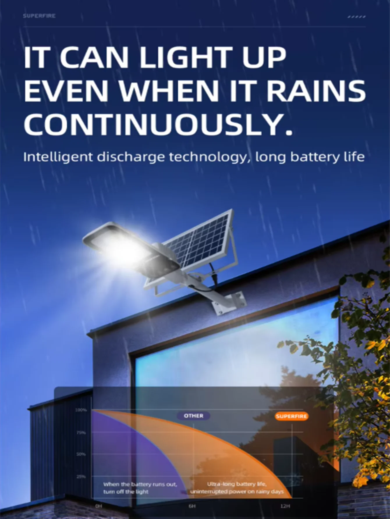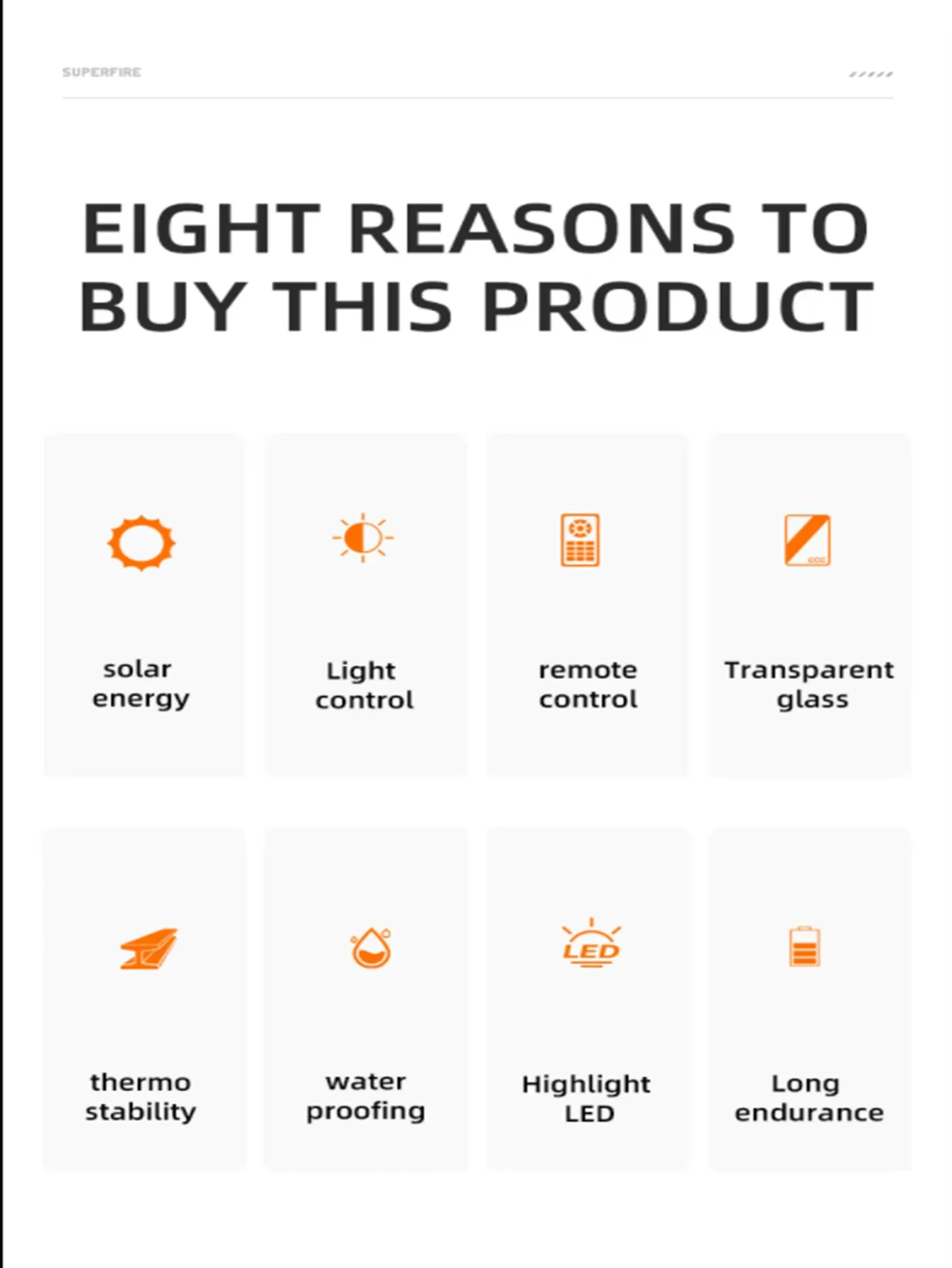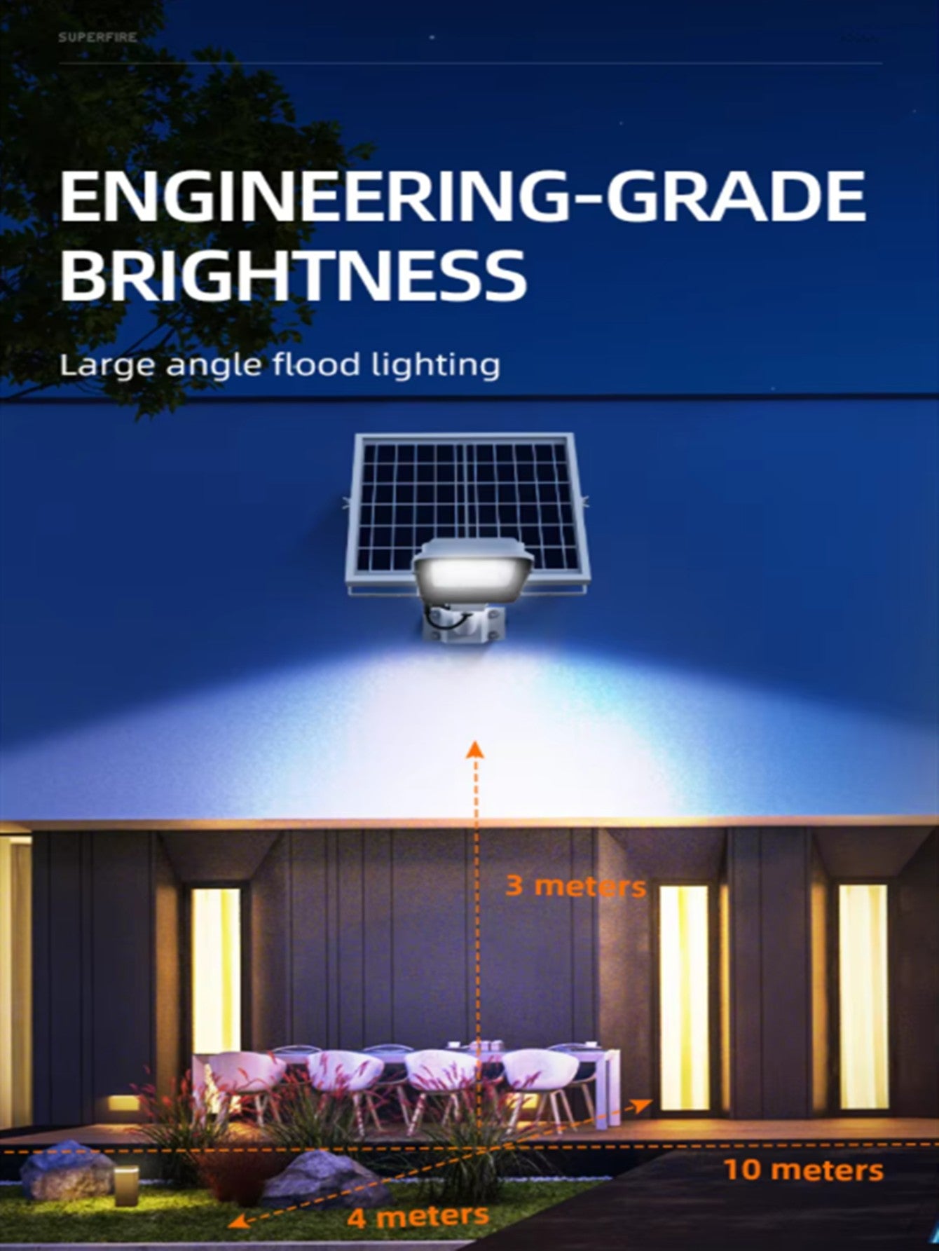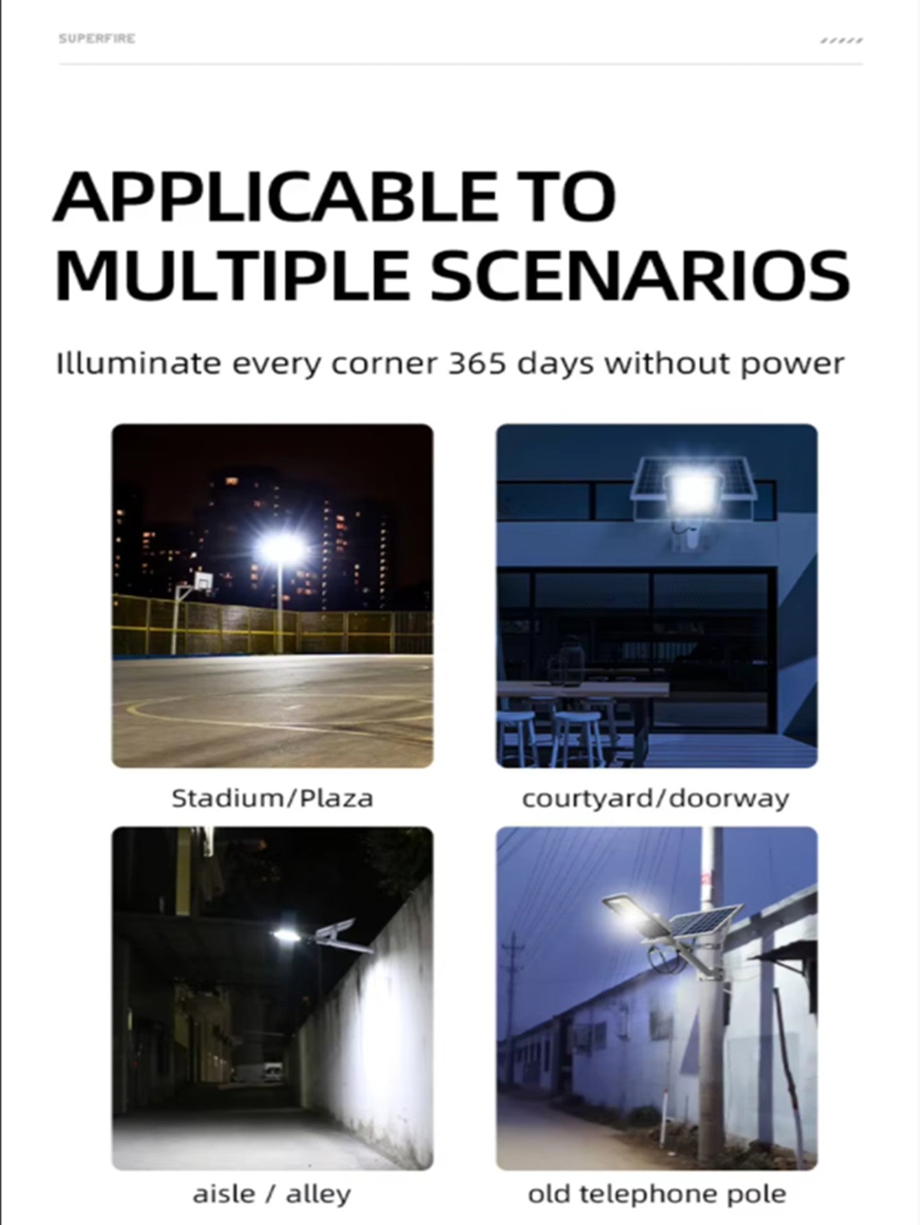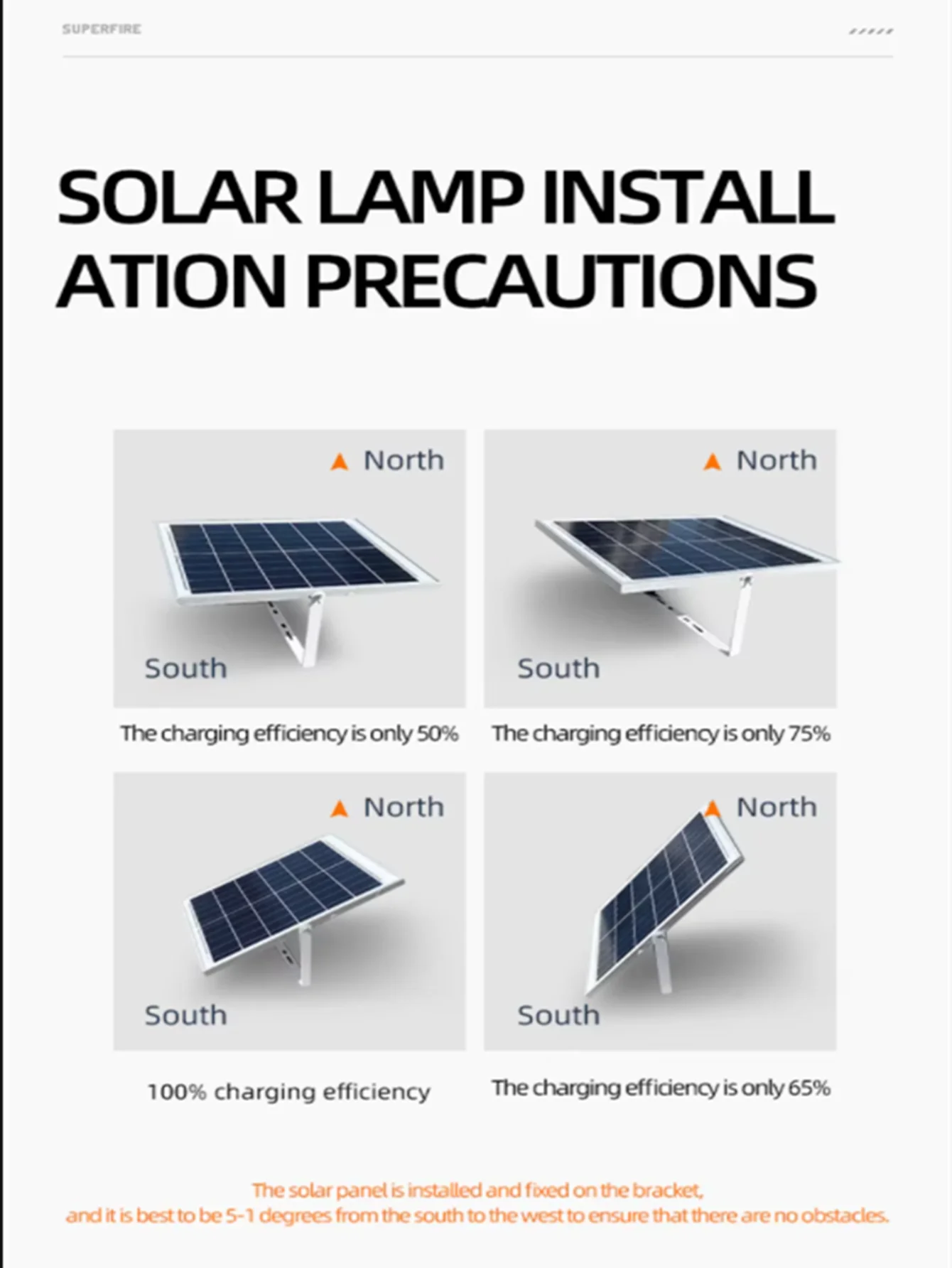 Accessories: remote control, installation screws, instruction manual, lighting fixture, solar panel. Installation bracket