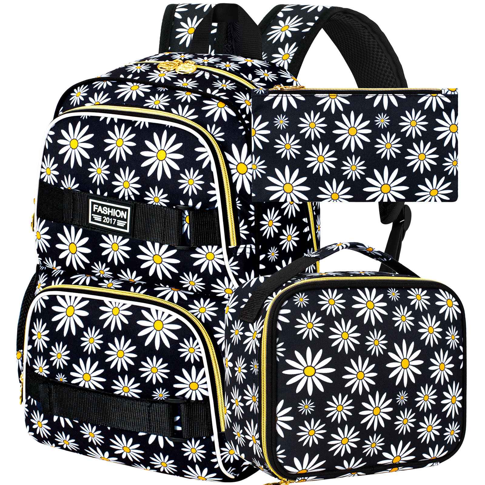 3PCS Daisy Girls Backpack, 17 Inch Laptop School Bookbag Teen College Water Resistant Kids Backpacks with Lunch Box Set - Grey