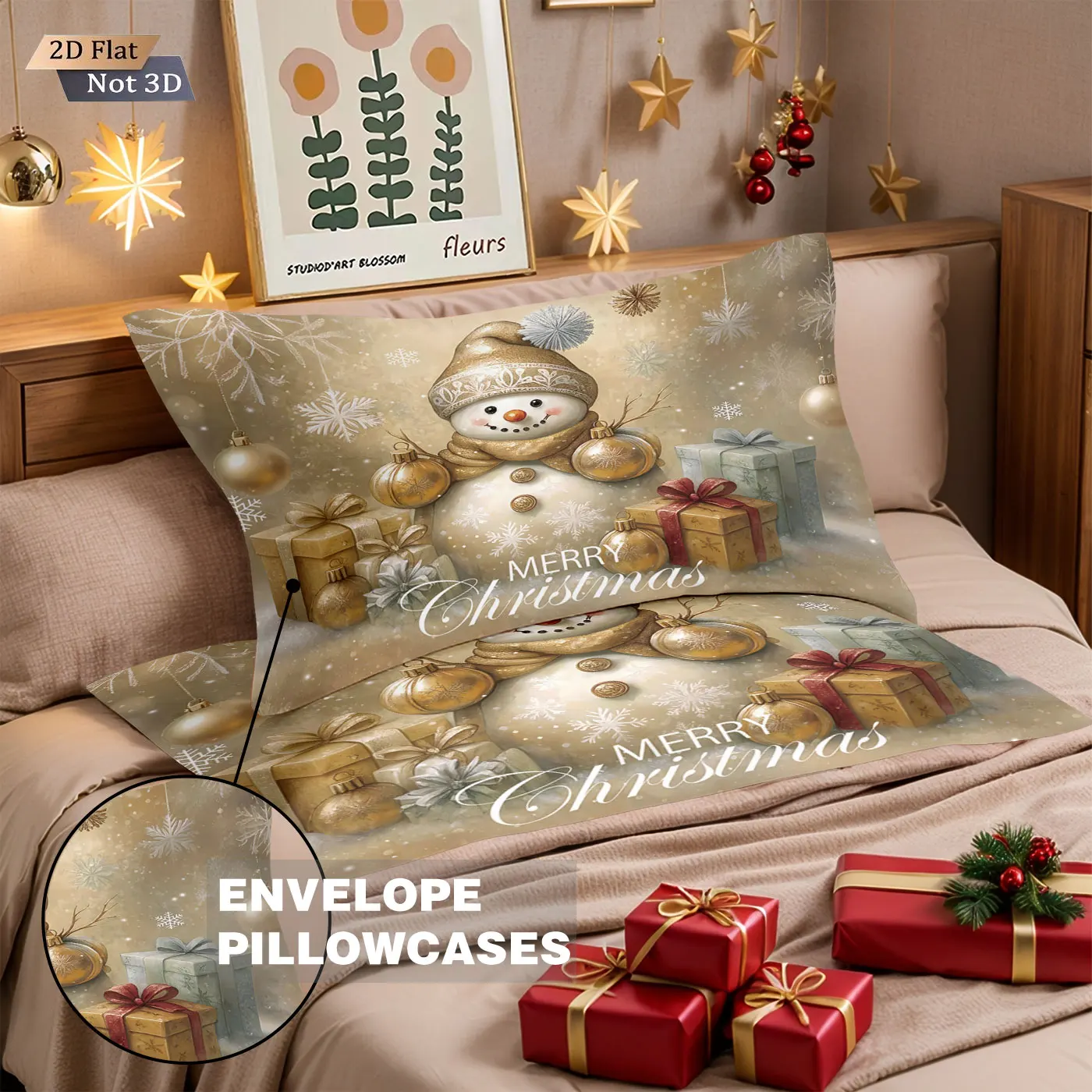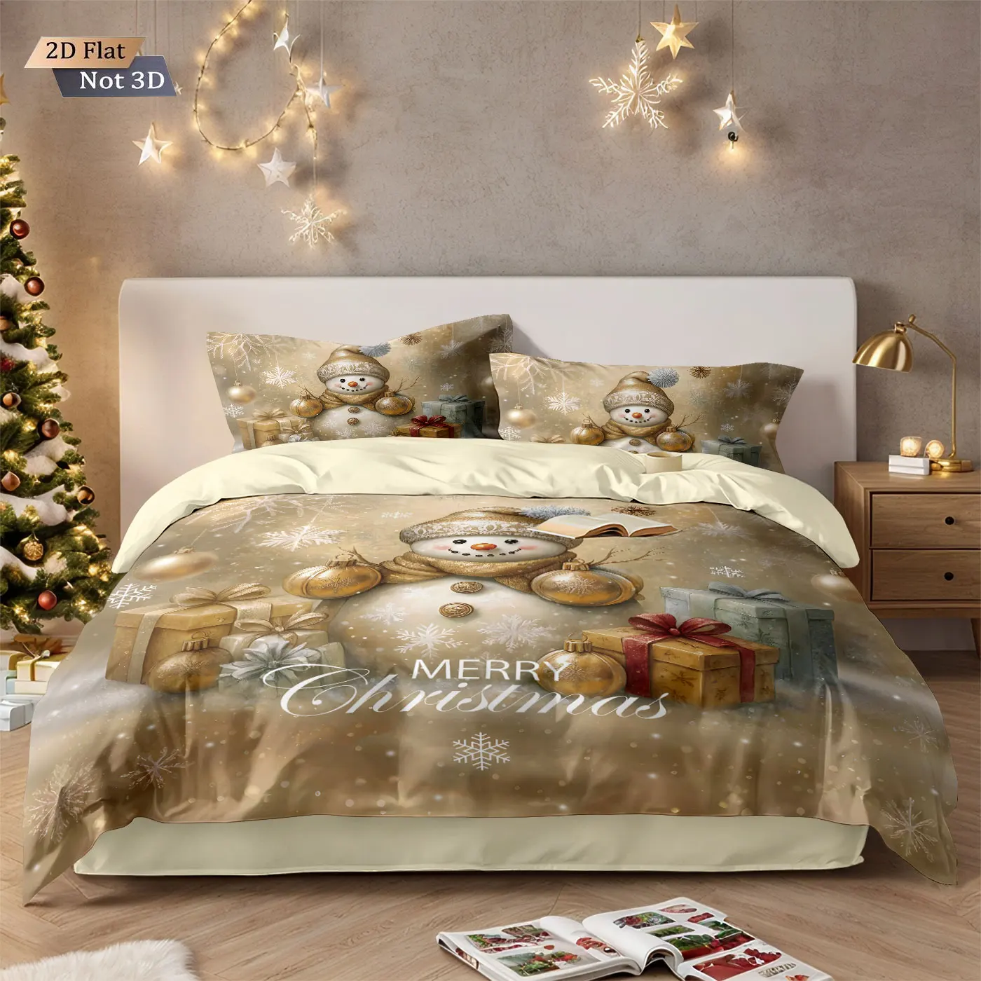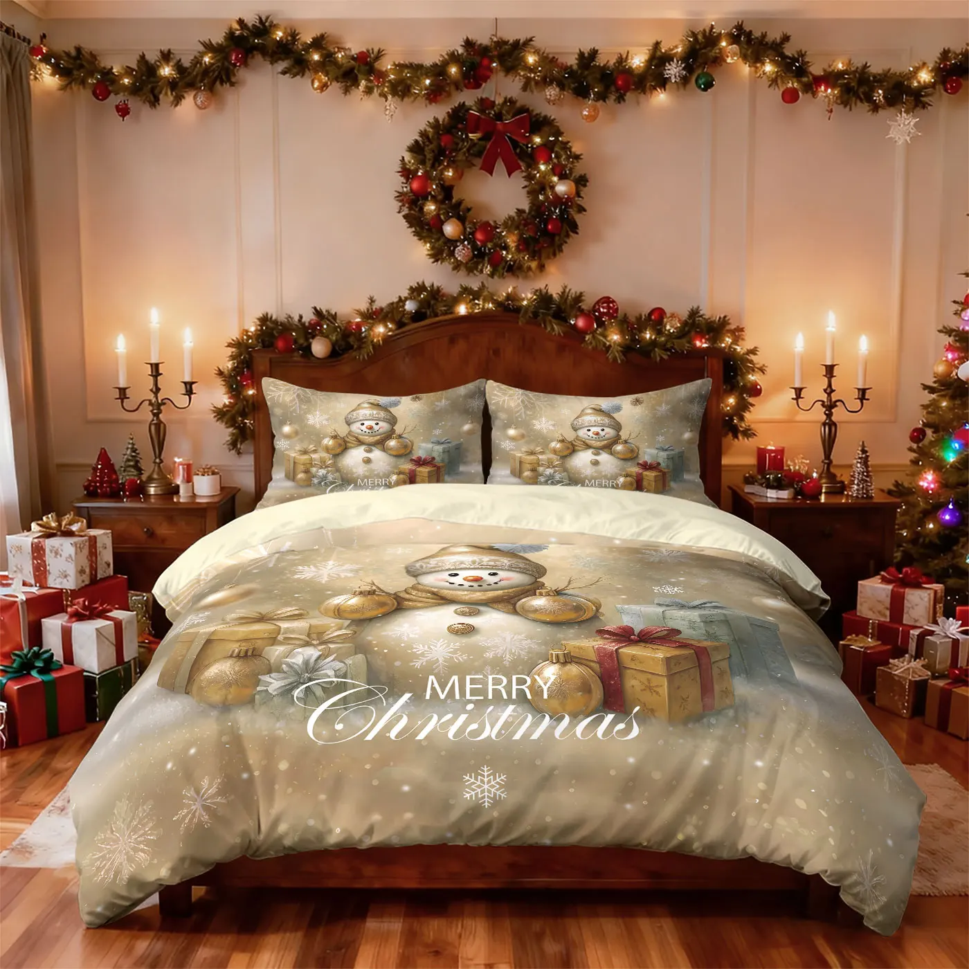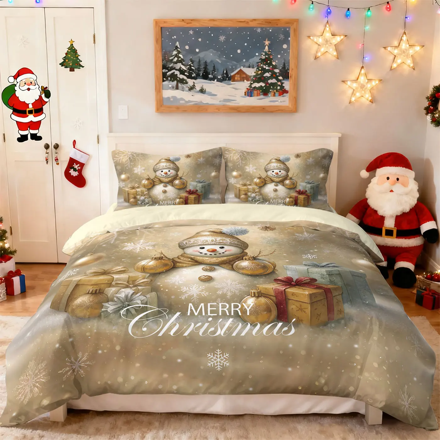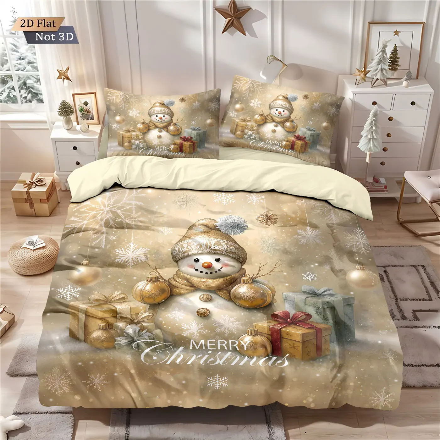 3pcs Golden Christmas Snowman Printed Chipless Bedding Set Soft Dormitory Bedroom Multiple Sizes Machine Washable