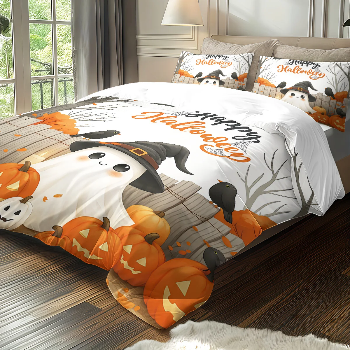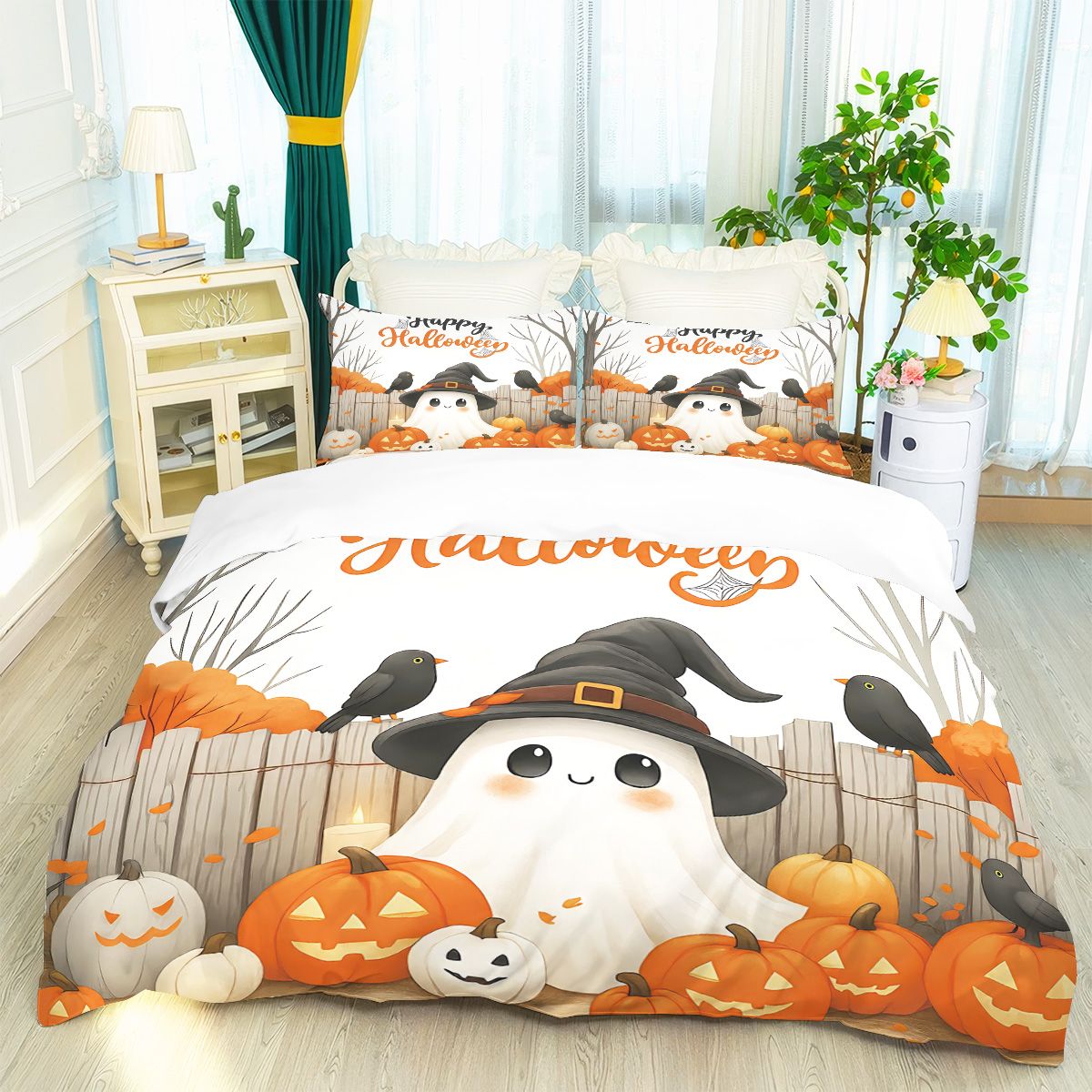 3pcs Halloween Cartoon Ghost Printed Duvet Covers, 1 Down Duvet Cover+2 Pillowcases, Coreless. Soft and Comfortable Bedding Set