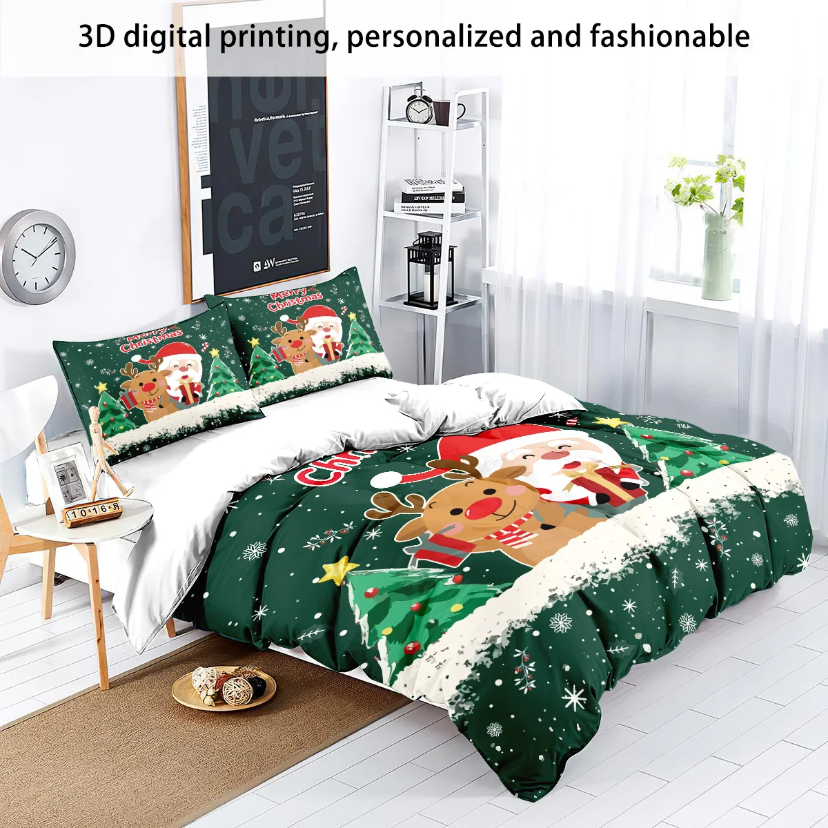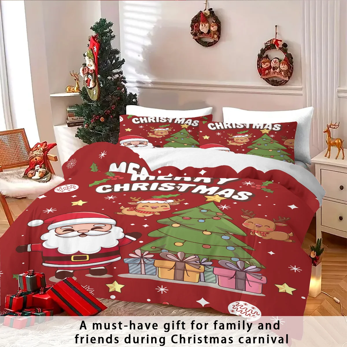 3pcs Santa Claus Christmas Tree Print Coreless Duvet Set Bedroom Dormitory Bedding Decoration Comfortable Machine Washable