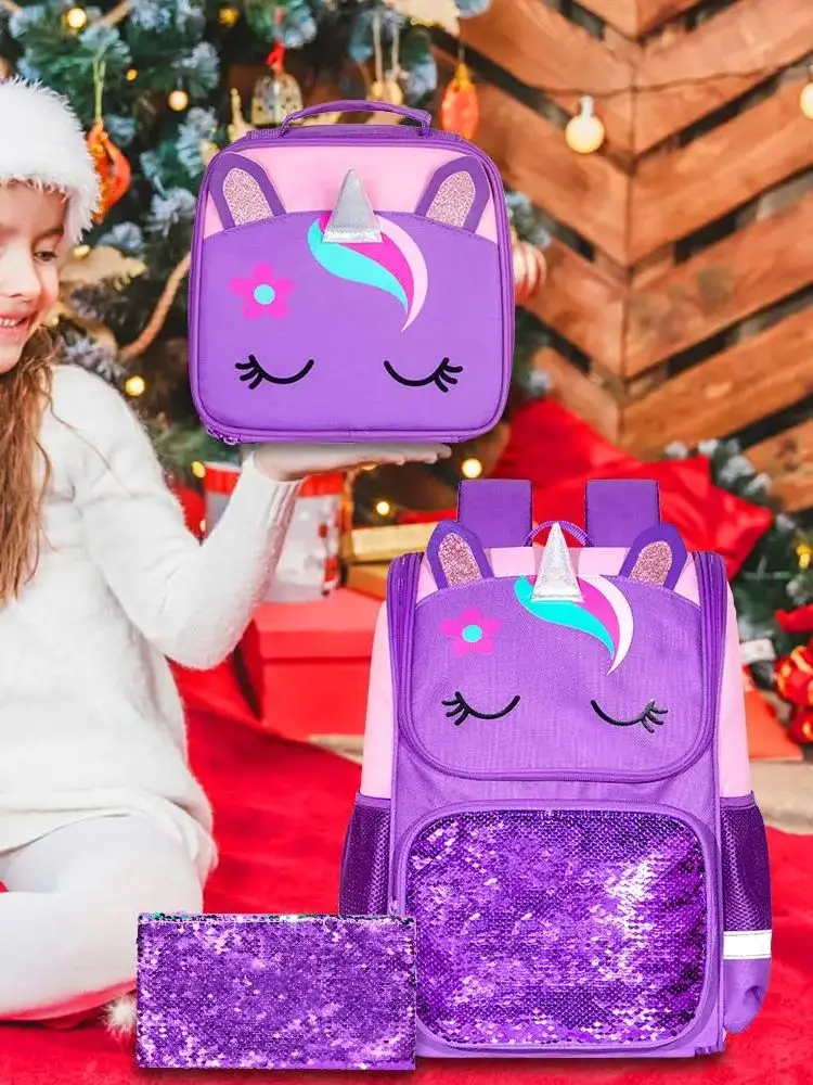 Sparkly Unicorn Backpack: With reversible sequins and a purple unicorn image, this girls'bookbag will make her scream with excitement for having such a backpack that makes her peers envious.