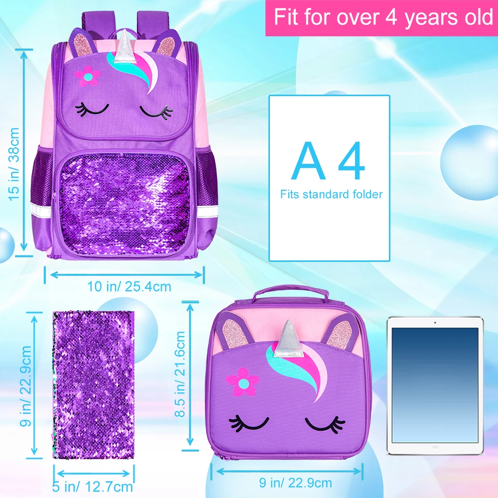 3PCS Unicorn Backpack, 15" Girls Sequin Bookbag with Lunch Box, Purple Kids School Bag for Elementary 2 sold