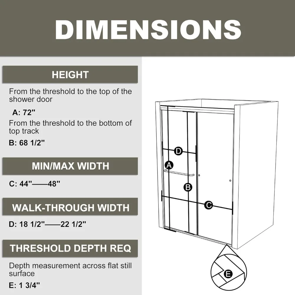 - ?Sliding Glass Shower Door? 44 - 48 in. W x 72 in. H, Door Opening Size: 18-1/2'' to 22-1/2''. The Sliding Shower Door - the perfect addition to your bathroom renovation. 1/4" (6mm) tempered glass is certified by ANSI, not easy to break, making your bathroom safer and more worry-free.