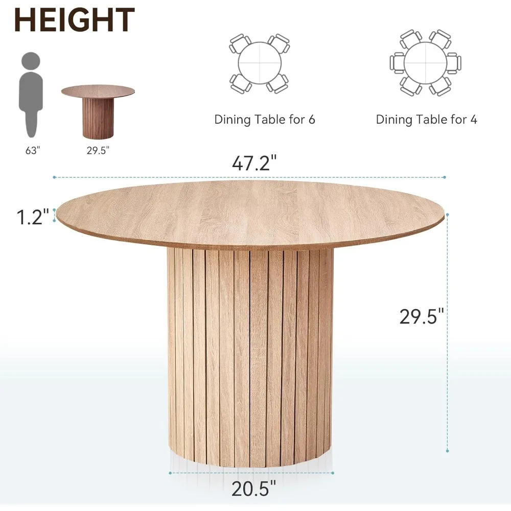 - IDEAL FOR 4-6 PERSON: A tabletop diameter of 47 inches, a height of 29.5 inches, and a base diameter of 20.5 inches, making it ideal for family meals or small gatherings. It comfortably seats 4 to 6 people without taking up too much space while providing ample dining area. Made from engineered wood with a wood veneer.