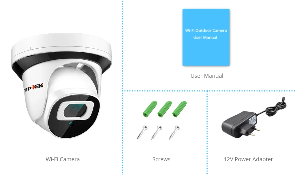 WiFi Camera X 1, Power Adapter X 1, Mounting Screws X 3, User Manual X 1.