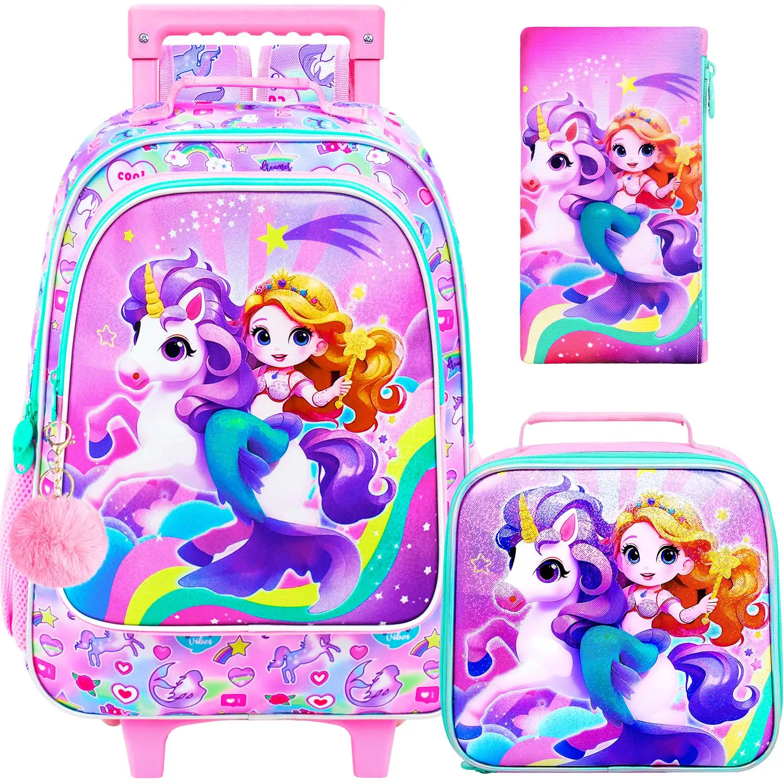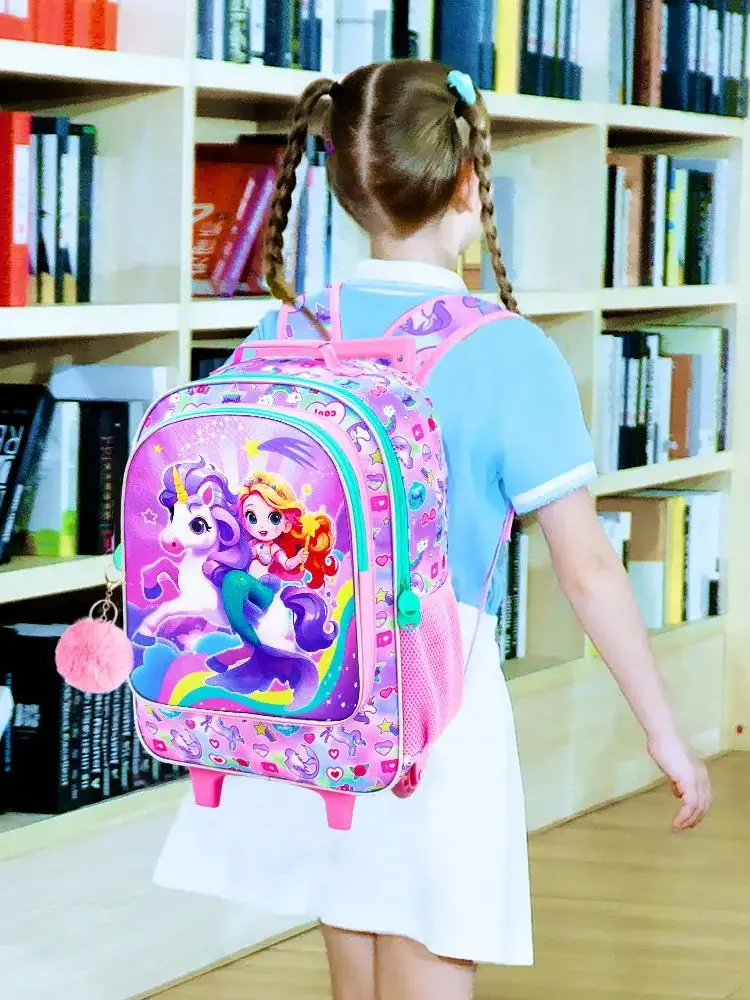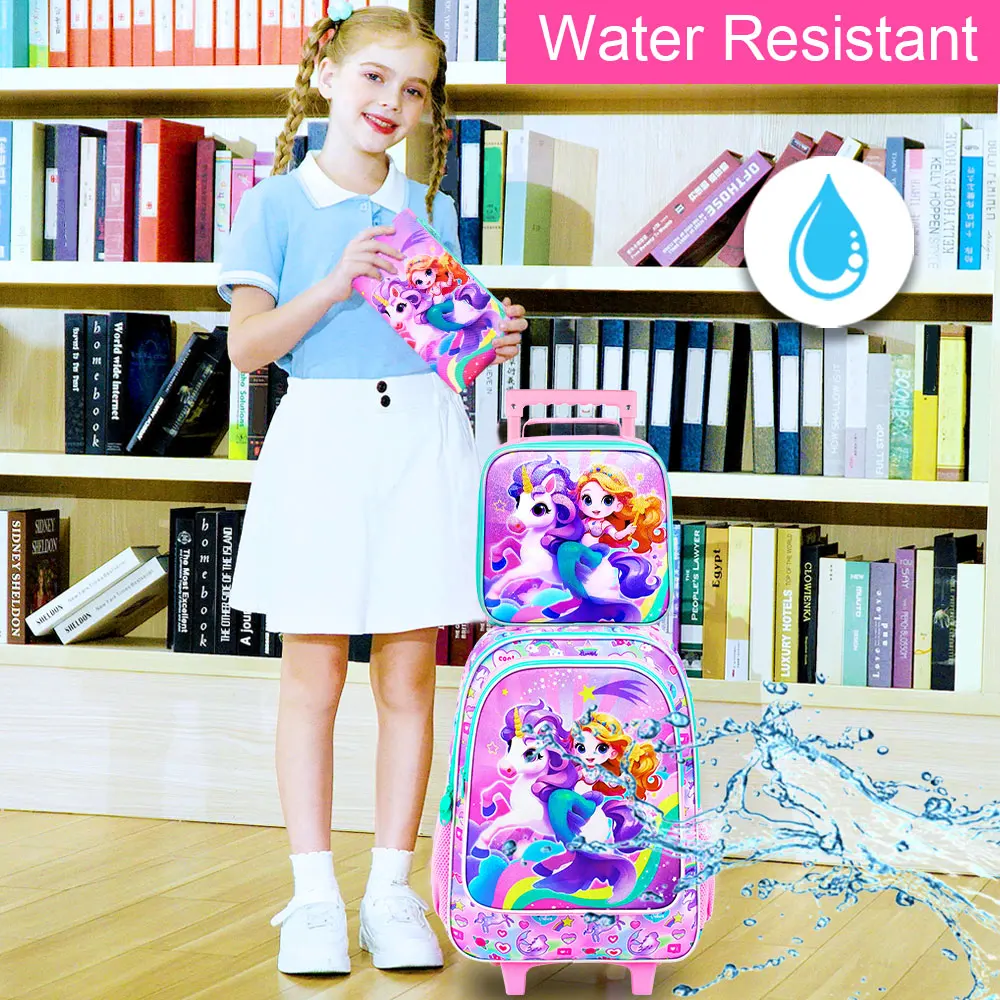 4PCS Rolling Bookbag for Girls, Cute Kids Mermaid Wheeled Backpack?Unicorn Roller School Bag with Wheels for Elementary Preschoo