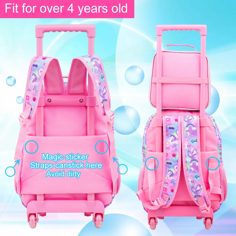3 in 1 Rolling School Backpack Set: Kids wheeled backpack(18"x12.5"x6")+ Lunch bag(9.5"x8.5"x4")+ Pencil bag, a rich girls backpack with wheels can carry more love, make your kids happier.