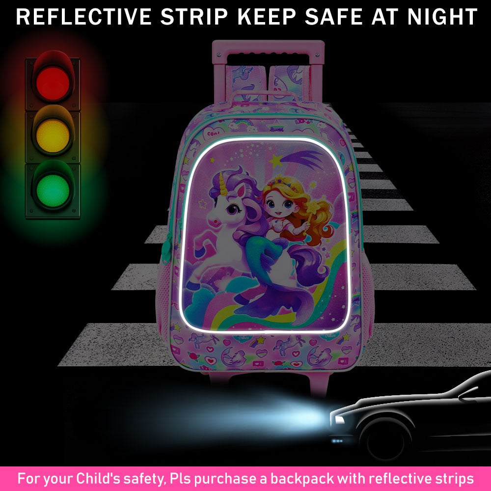Cpsia Compliant Girls Rolling Backpack: Eye-catching reflective stripes increase walking safety. Premium water-resistant fabric, tested and approved, she can use this kids rolling backpack with confidence.