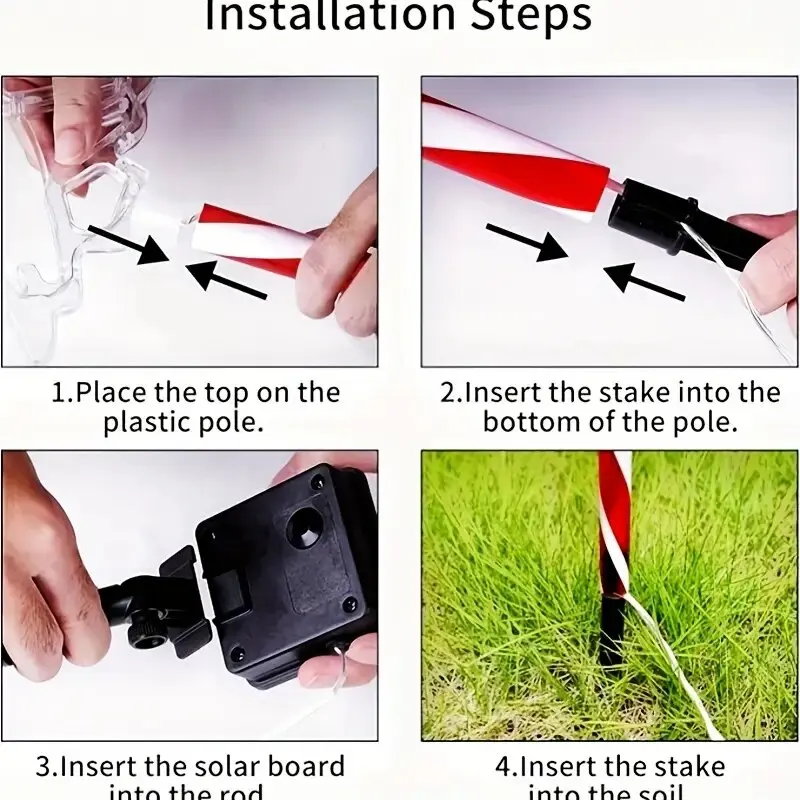 4. Easy to install: It is easy to assemble the parts into a shape, and then insert the metal pile into the soil. The decorative light keeps the switch "on" in direct sunlight, automatically charging during the day and automatically lighting up at night.