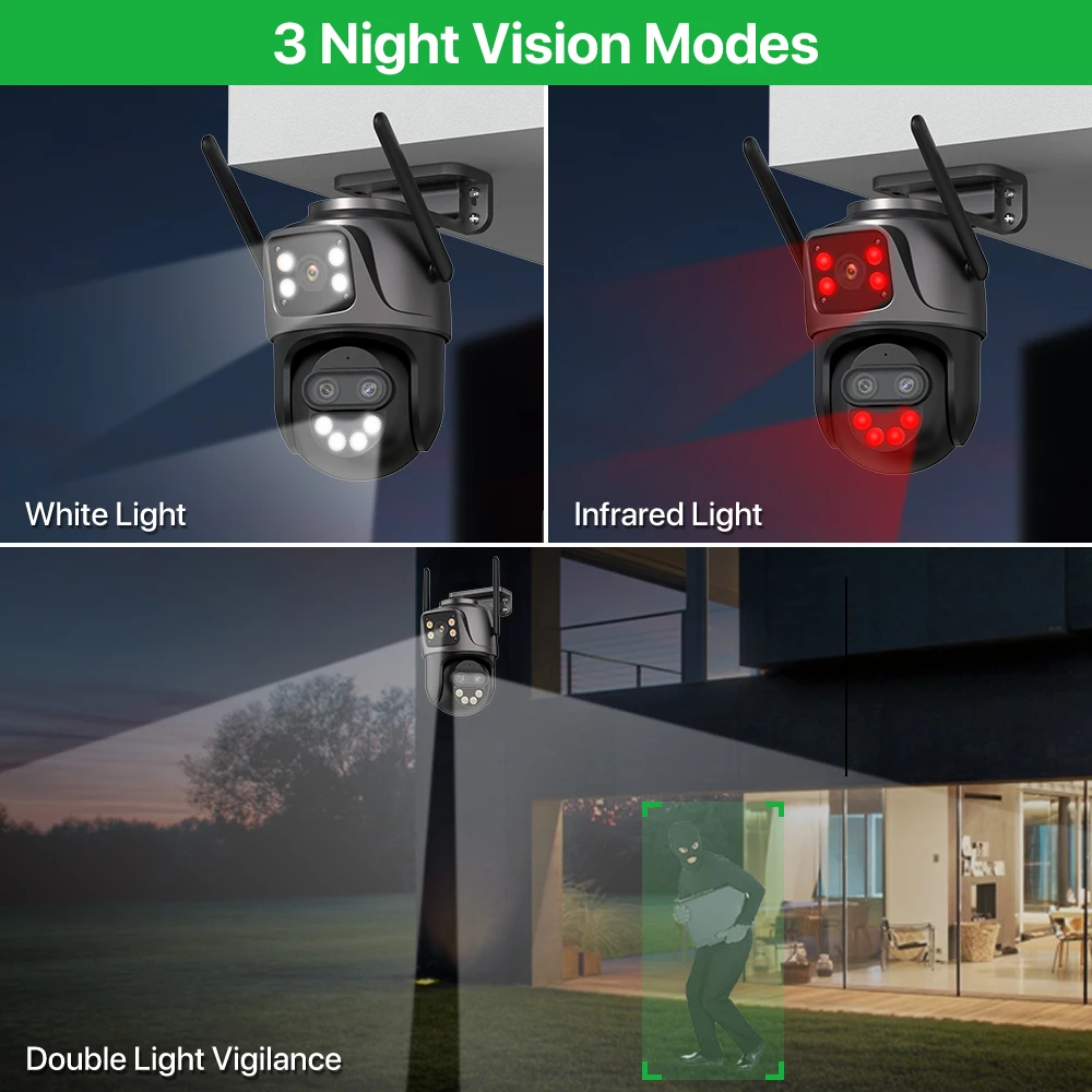 - Dual light source design, built-in infrared light + white light, night vision infrared and night vision full color can be set;