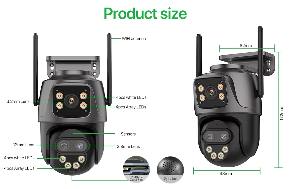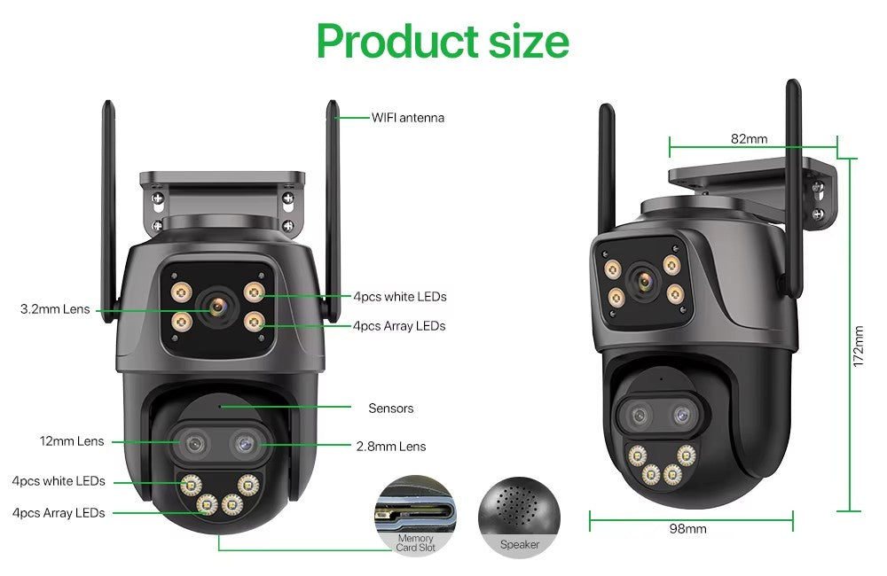 3-lens, 2-screen, Notifications alarm, humanoid tracking, two way voice intercom 360 monitoring, full color night vision, IP66 waterproof, mobile phone remote monitoring,Share video, SD card storage, 24 hours video recording