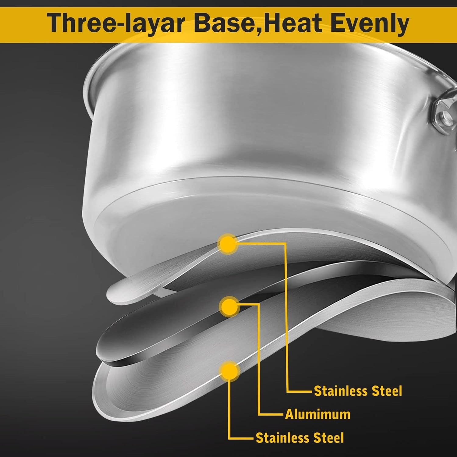 - ?High-Quality Materials? Drip-free pouring tri-ply construction.The first and third layer is stainless steel for sturdy nonstick pots features. The aluminum in between conducts consistent even heat distribution