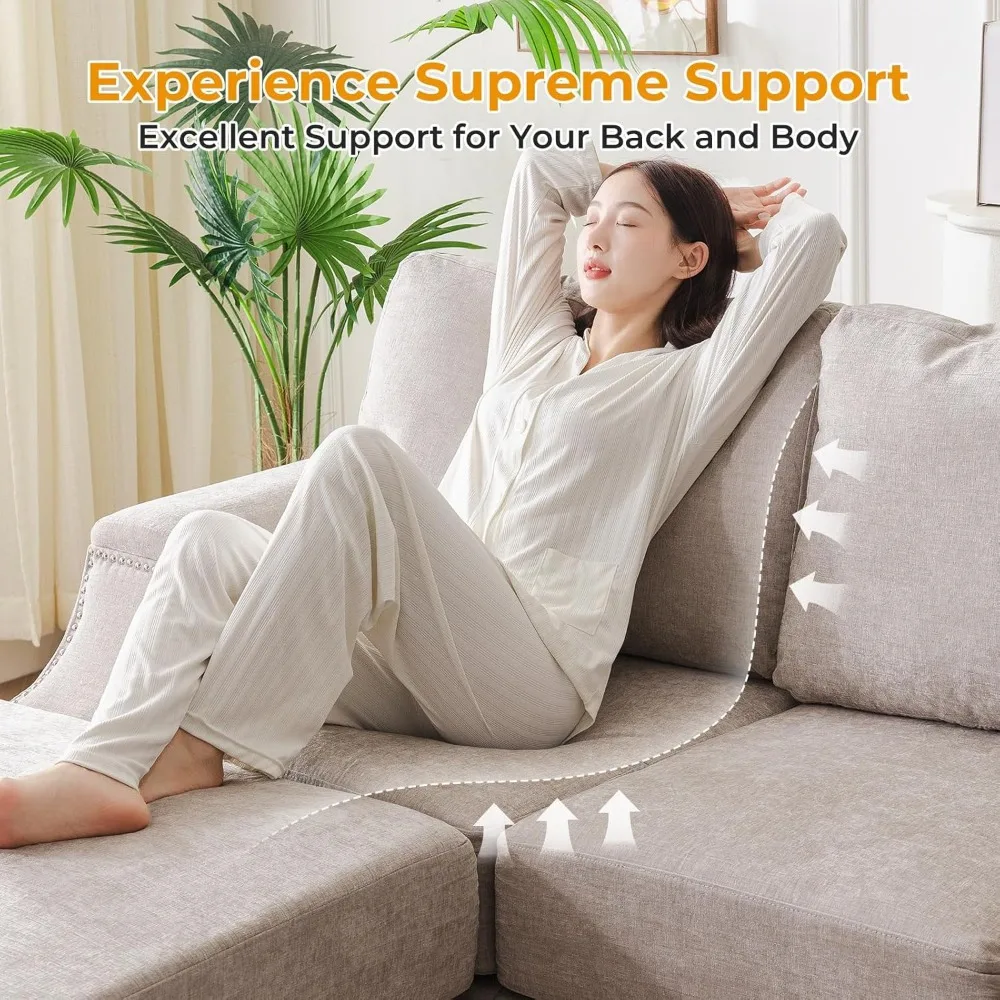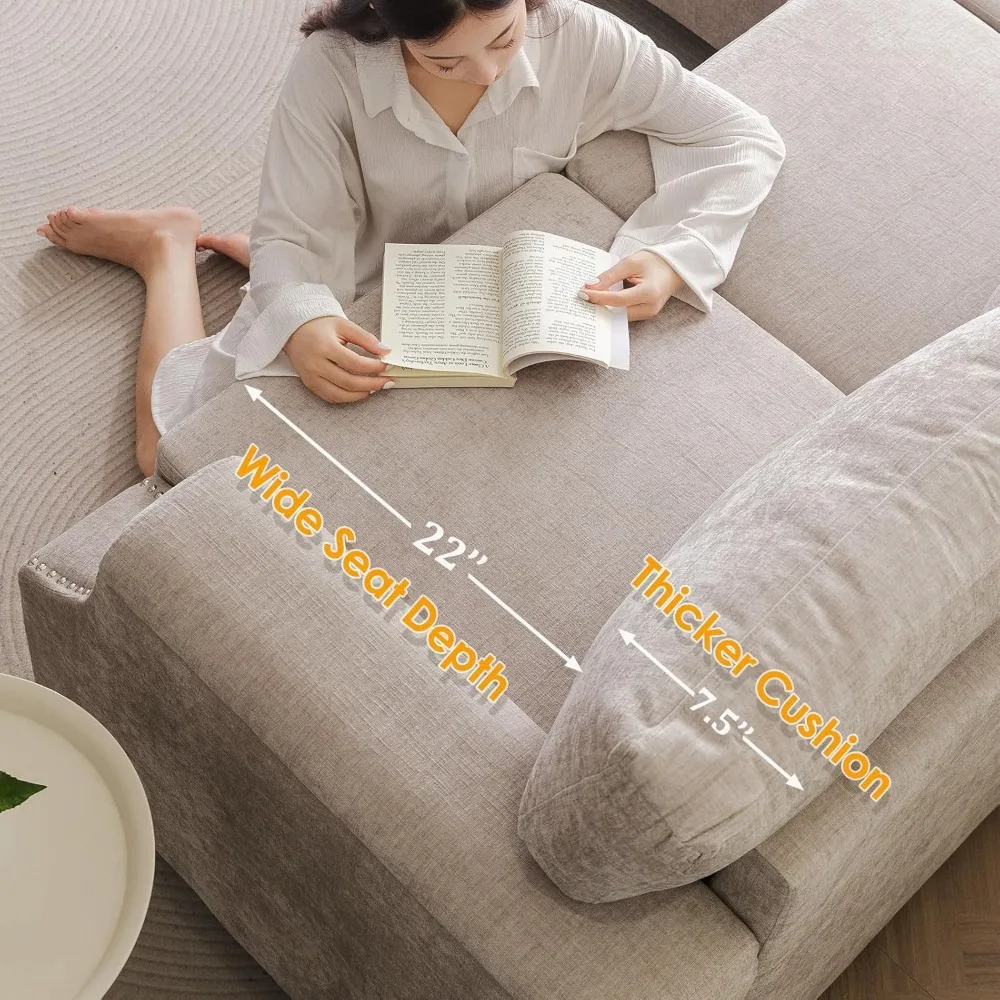 Storage & Movable Ottoman?Features a 22.8''*31.8''*7.4'' storage compartment for slippers, blankets, remotes, and books—eliminating clutter while adding convenience. Perfect for small spaces like apartments or living rooms, this modular sectional sofakeeps your area tidy and functional.Move freely,more freedom in combination. Premium High-Resilience Foam Cushions?Made with 25D high- resilience foam(vs. standard 18/21D), our 7.8in seat cushionsprovidelong-lasting supportwithout sagging. Ideal for lounging, gaming, or reading, they offer cloud-like comfortwhile maintaining firmness over time. Sturdy Solid Wood Frame: Built with solid wood(not metal frames), this L-shaped sectional sofaensures easy assemble and enhanced stability. Each seat holds up to 350 lbs, so you can relax,or even jump with confidence. Nailhead Trim & : Combined with the nailhead on the , the original sofa becomes more stylish and decorative. With a built-in 19.7 '* 24.4' * 5.1 'storage on each , which can be used to place blankets on a daily basis. You can easily pick them up when you need them.Bring more convenience to your life. Notes:All the cushions and pillows are vacuumed packed for easy transportation,it may take up to 2-7days to fully expand to its original shape.You can also give it a firm pat to help make it fluffier.