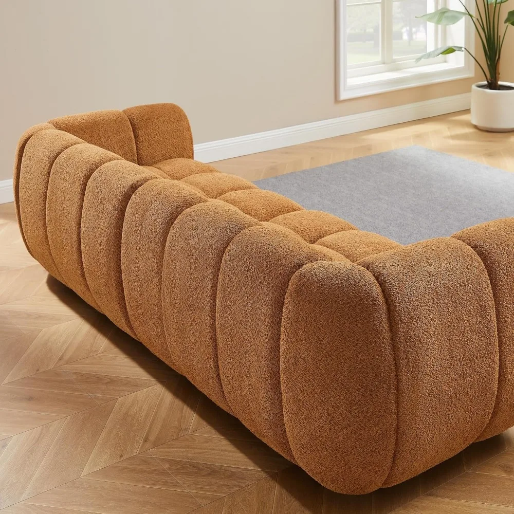 Modern Aesthetic: The loveseat sofa features a minimalistic and elegant design, showcasing smooth lines and soft curves that add a contemporary touch to any space. Its charming, rounded silhouette evokes the warmth of a freshly baked loaf, instantly enhancing the space's warmth and adds a playful touch Boucle Fabric: Crafted from high-quality Boucle fabric, this sofa couch offers a breathable, durable, and wrinkle-resistant solution. The slight stretch and plush texture create a cloud-like feel, ensuring unparalleled comfort Robust Construction: Built on a solid wood frame, this loveseat ensures unmatched stability and longevity. Capable of supporting up to 800 lbs, it maintains its shape and support even after extensive use, making it a reliable choice for any setting. Versatile and Cozy: Whether relaxing, enjoying coffee, or chatting with family and friends, this modern sofa fits seamlessly in living rooms, apartments, or reception areas. Create a welcoming nook perfect for social gatherings and family time Easy Assembly: The comfortable Boucle loveseat is designed for easy assembly. The dimensions are approximately 88.98" W * 34.25" D * 25.2" H, shipped in 2 packages that may arrive at different times